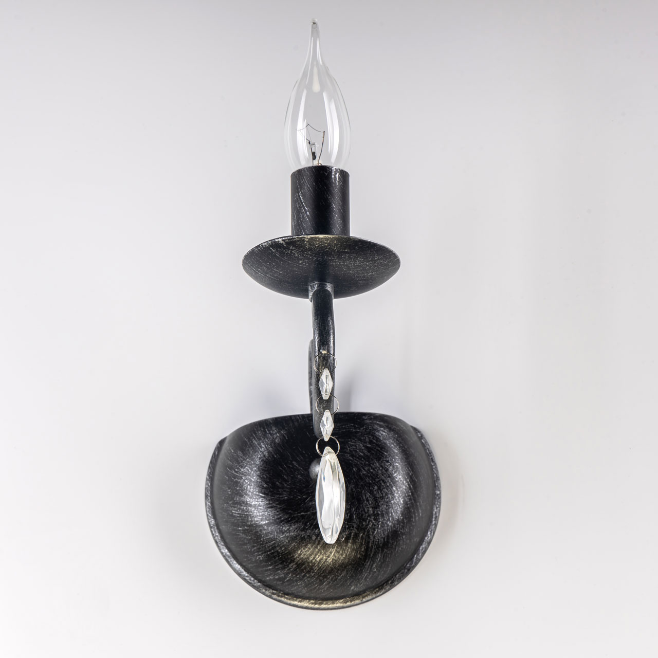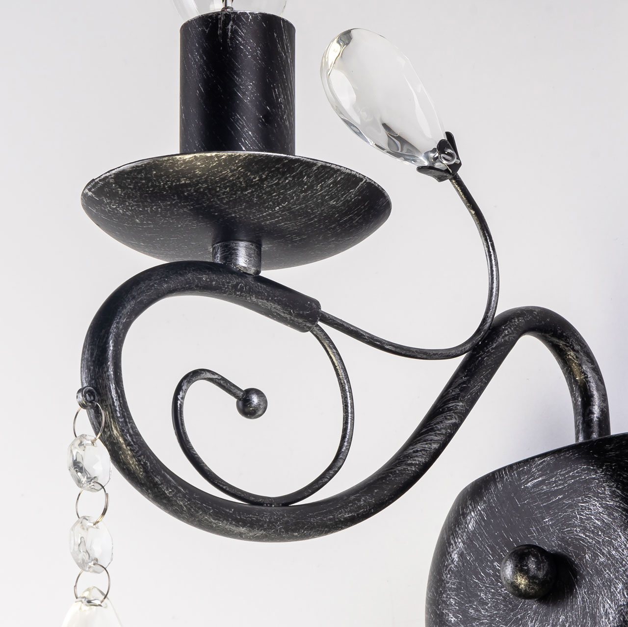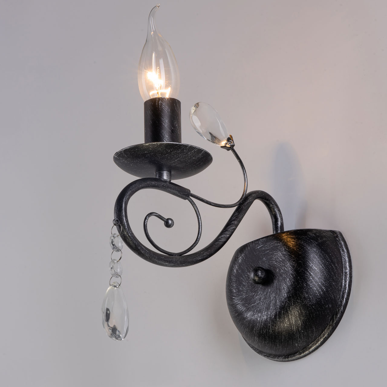 Металлическое основание бра окрашено в черный цвет и обработано по технологии хай-лайт в серебряный цвет. Настенное бра декорировано стеклянными подвесами миндалевидной формы.Характеристики