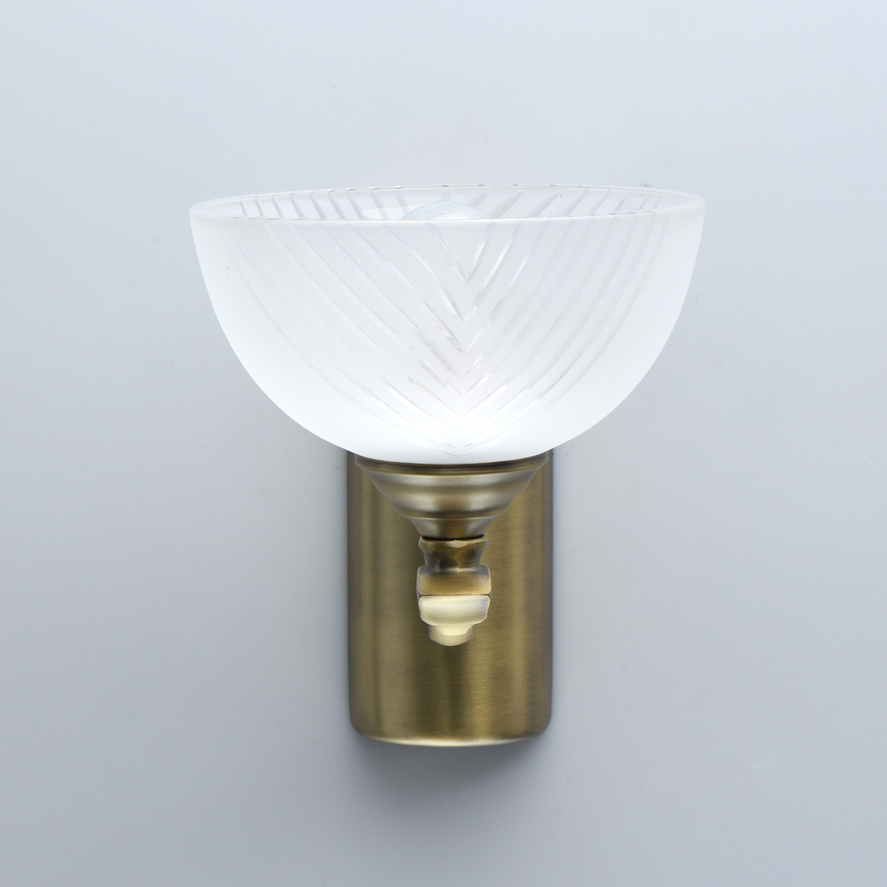 Основание бра выполнено из комбинации сплавов металлов и гальванизировано в цвет античной бронзы. Рожок выполнен по технологии художественного литья. Светильник декорирован стеклянным плафоном, обработанным по технологии пескоструйного матирования. На плафон нанесен геометрический рисунок с помощью алмазного резца.Тип помещения