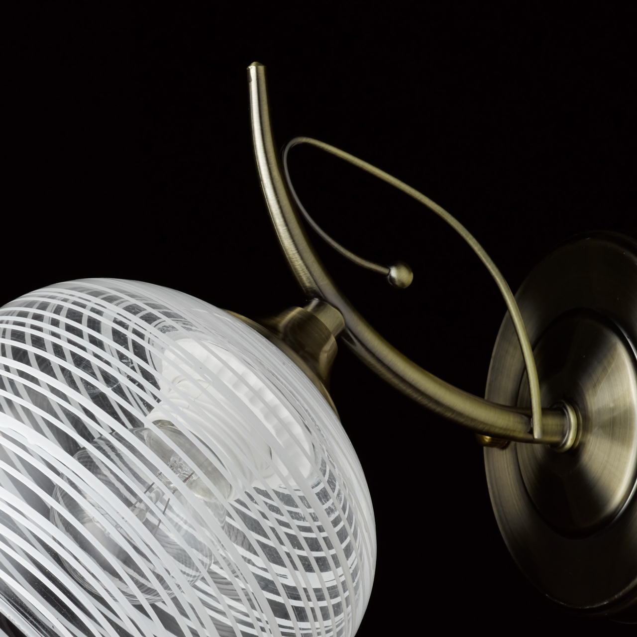 Основание бра выполнено из металла и гальванизировано в цвет античной бронзы. Стеклянный плафон окрашен белой краской в тонкую полоску. Края плафона оплавлены.Тип помещения
