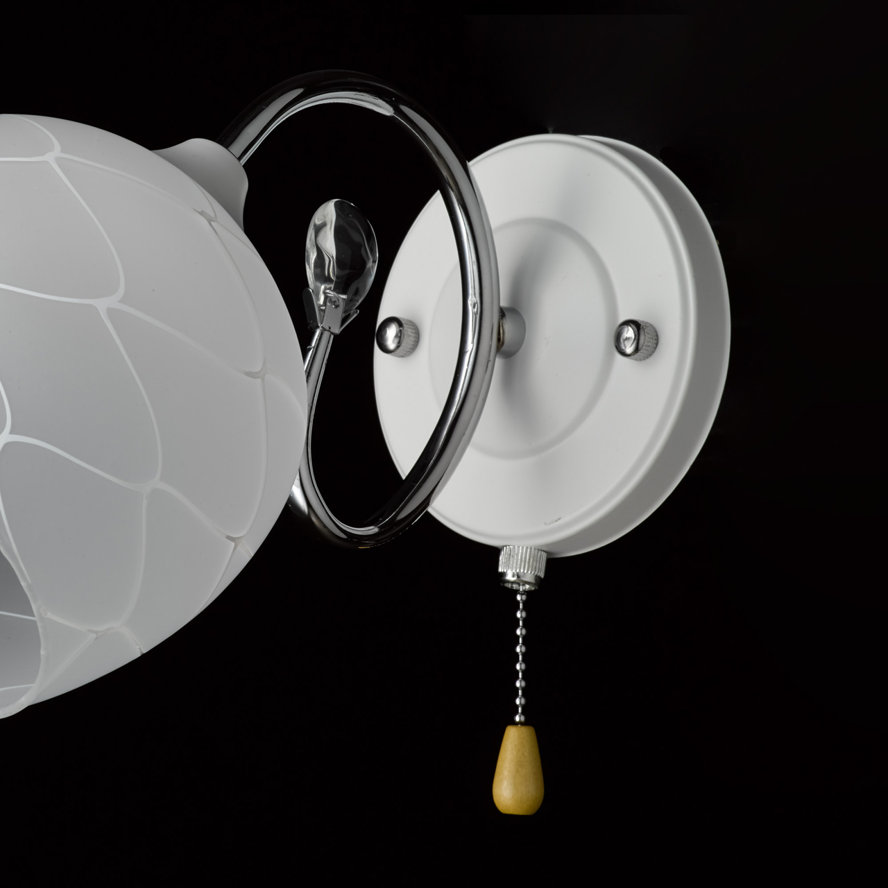 Актуальное сочетание металлического основания белого цвета и хрома. Плафон гладкого матового стекла с фантазийным рисунком мягко рассеивает свет.. Декор из хрустального стекла на рожках создает дополнительный акцент. Выключатель на корпусе обеспечивает дополнительное удобство.Преимущества модели