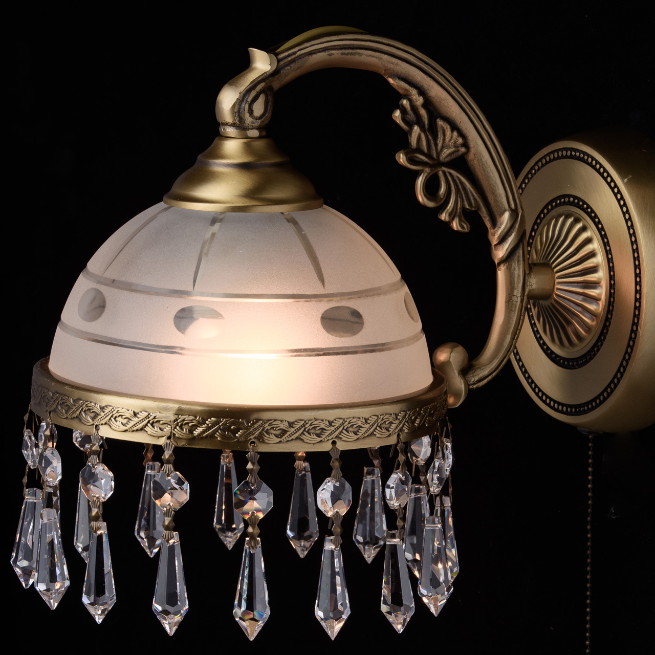 Арматура бра выполнена из латуни с последующим патинированием и покрытием защитным лаком. Рожок изготовлен по технологии художественного литья. Плафон декорирован чеканкой из латуни, также покрытой патиной и защитным лаком. Плафон выполнен из стекла, обработанного пескоструйным матированием, рисунок нанесен алмазной резьбой. Светильник декорирован хрустальными подвесками сложной огранки.Тип помещения