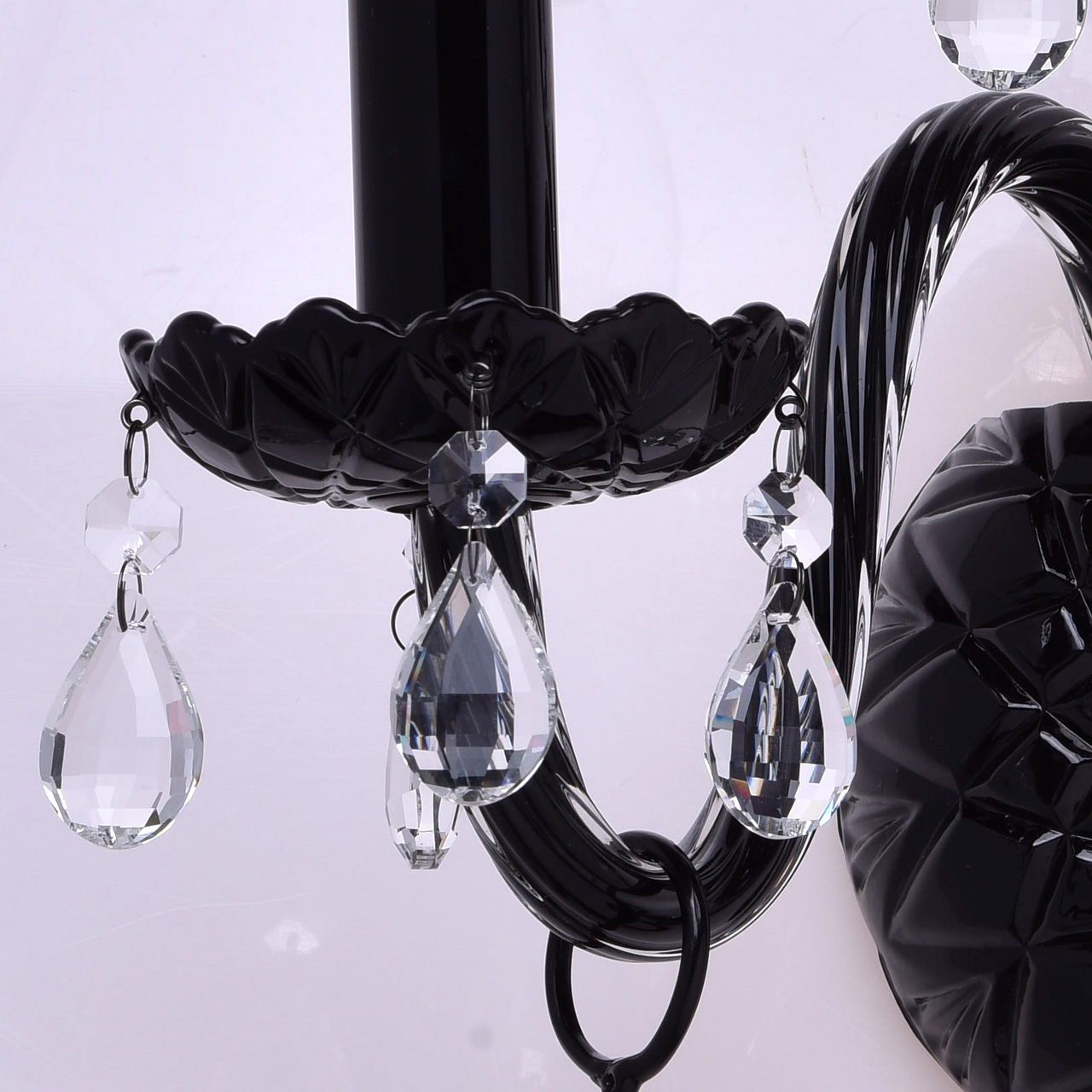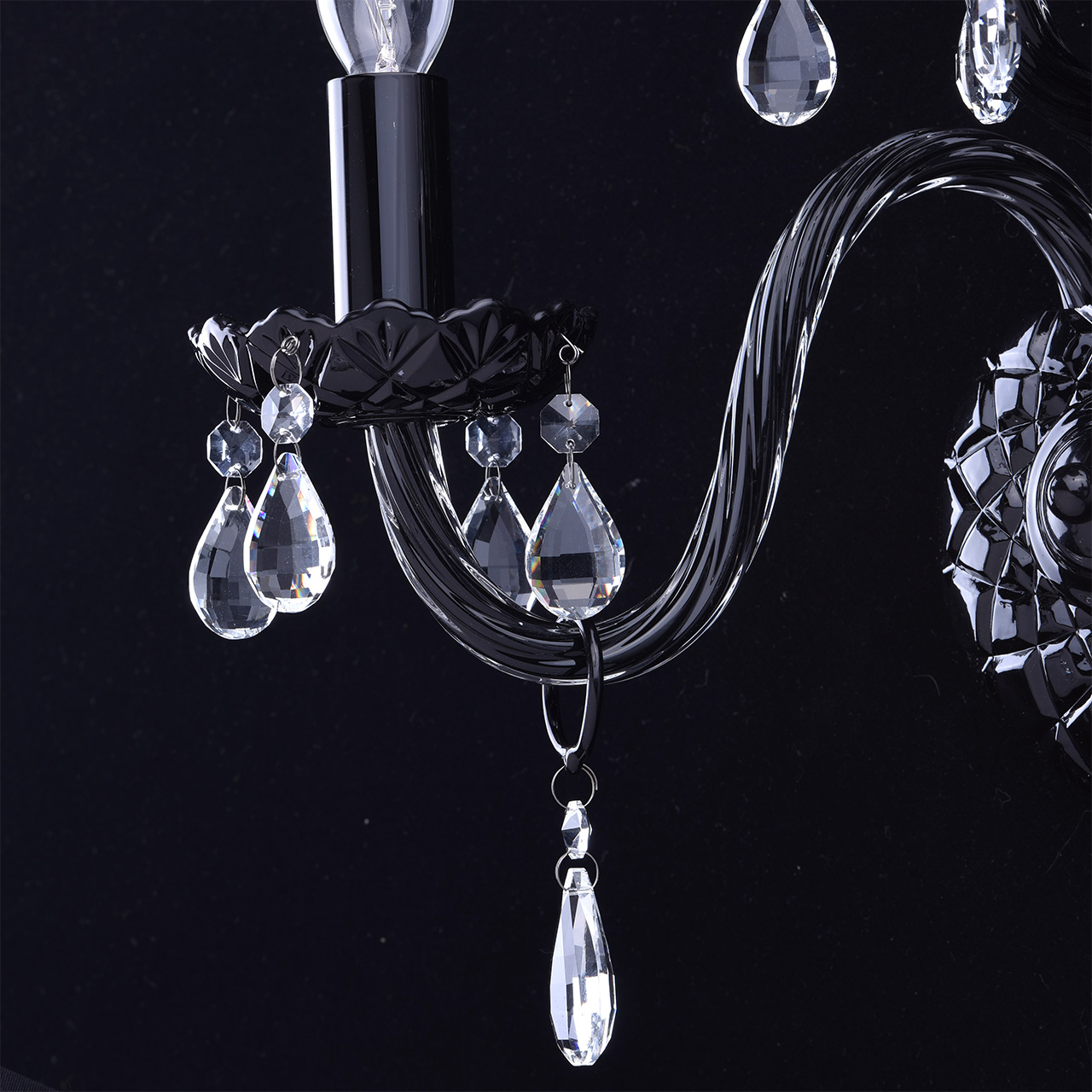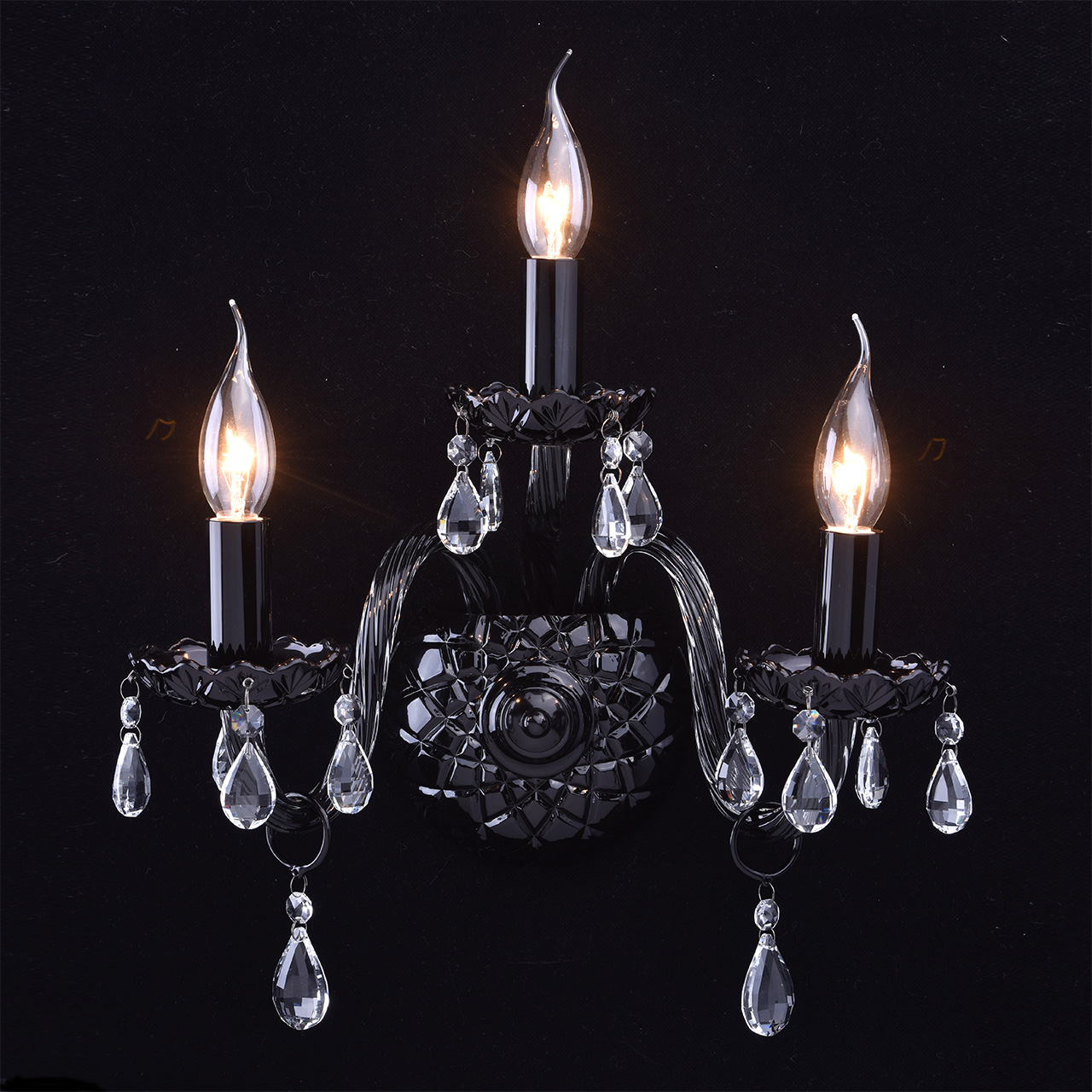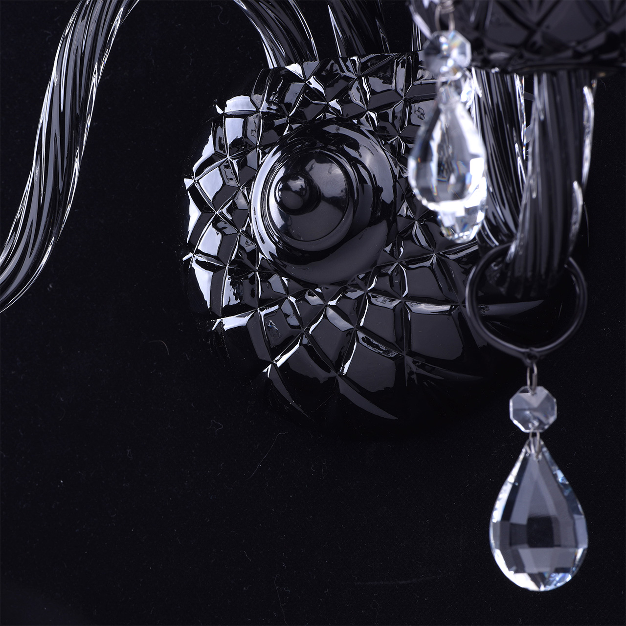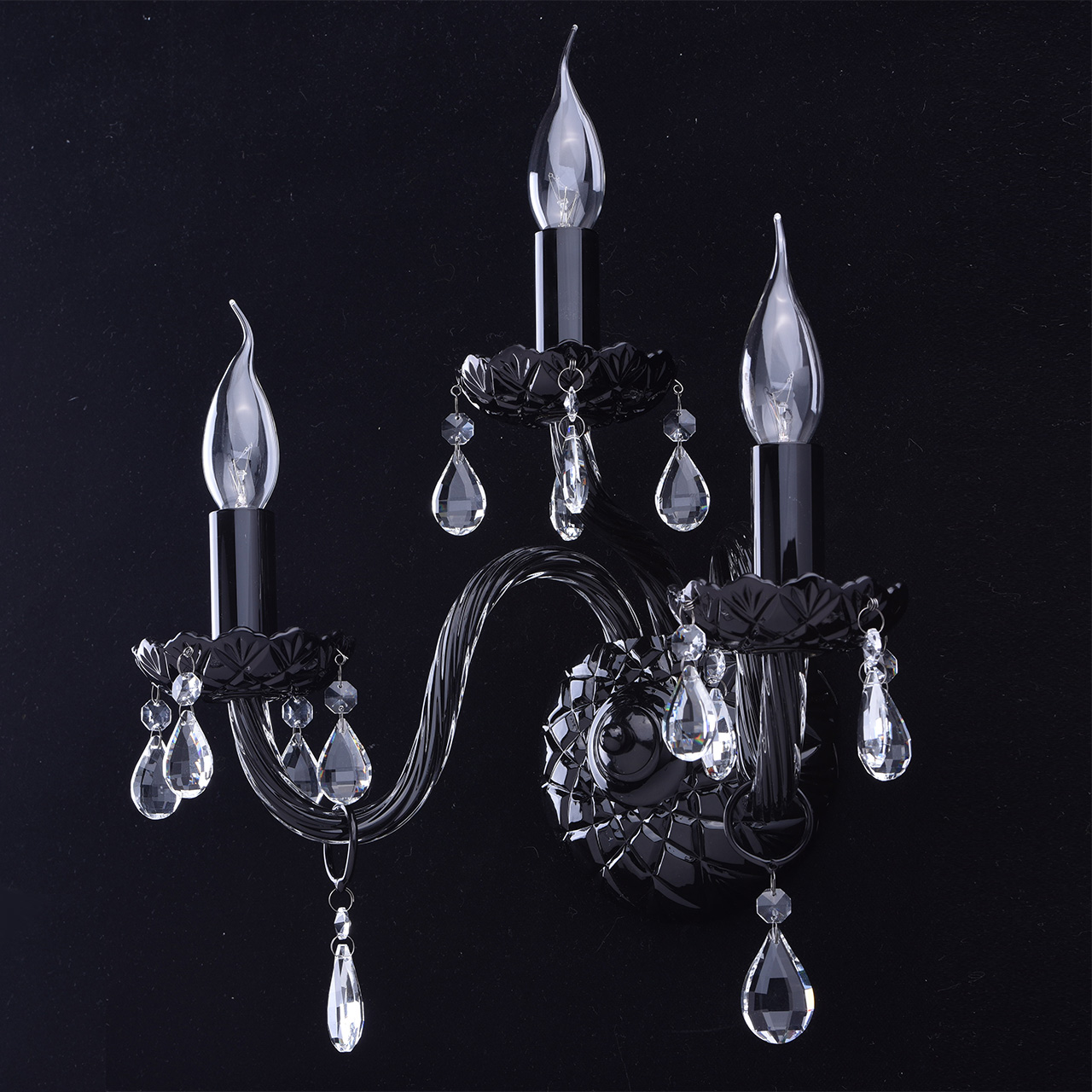 Арматура бра закрыта декором из стекла, отлитого в сложную форму и окрашенного в черный глянцевый цвет. Рожки выполнены из витого стекла гутным способом и окрашены изнутри. Светильник декорирован прозрачным хрусталем сложной огранки.Тип помещения
