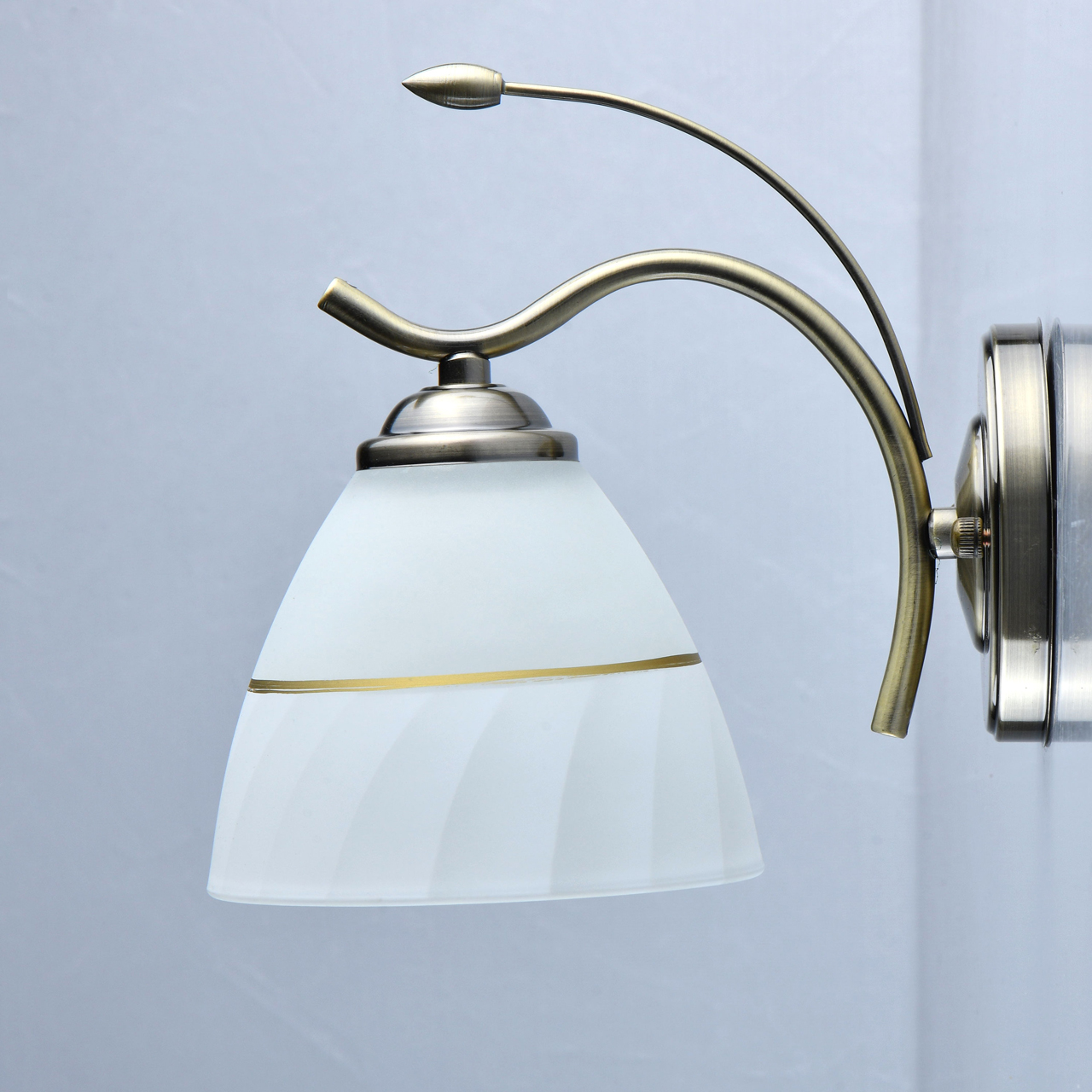 Основание светильника выполнено из сплава металла и гальванизировано в цвет античной бронзы с последующим лакированием. Стеклянный плафон матирован и окрашен вручную в белый цвет. Полоска золотого цвета отделяет окрашенную часть от матированной.Тип помещения