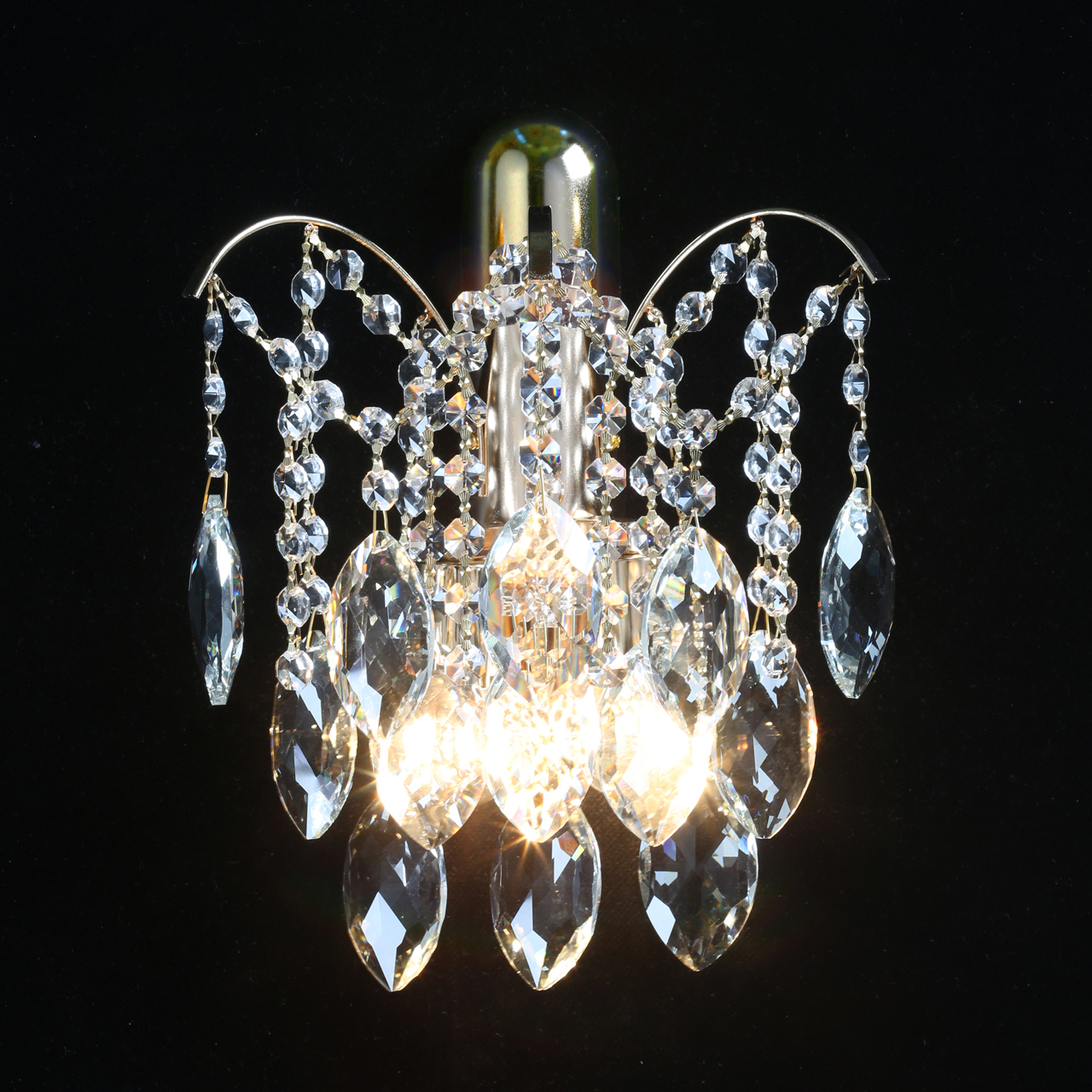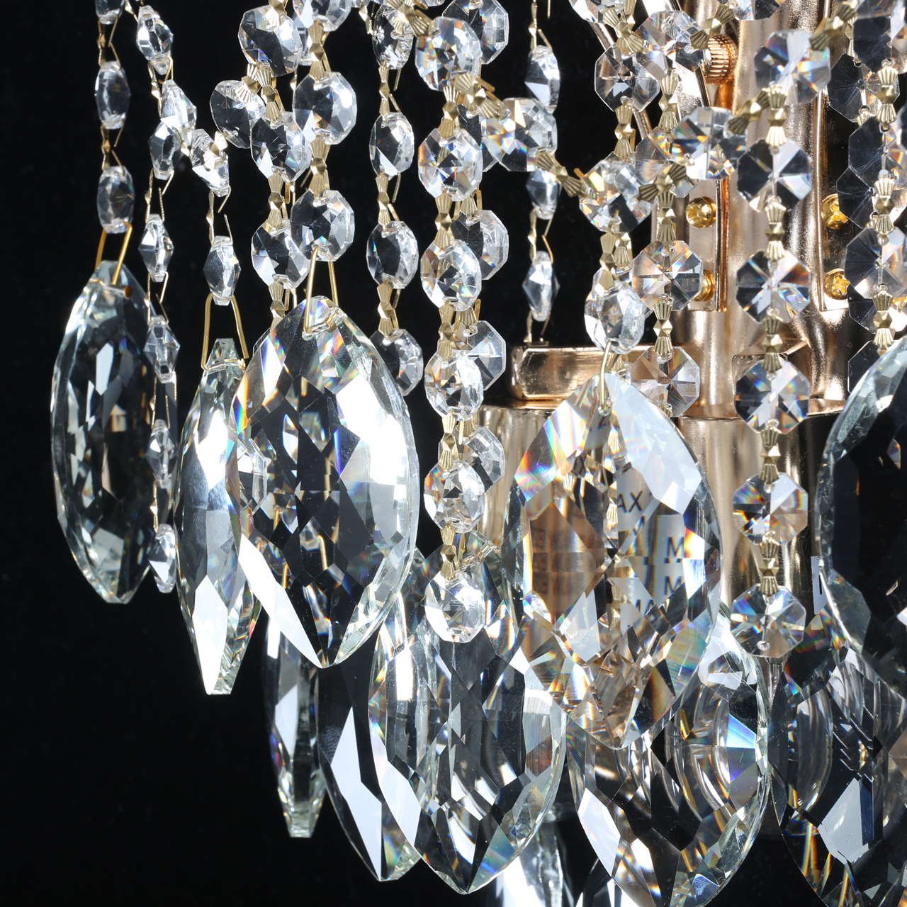 Основание светильника выполнено из сплава металла и гальванизировано в цвет золота. Светильник декорирован прозрачным хрусталем формы октагон и хрусталем оригинальной вытянутой овальной формы.Тип помещения