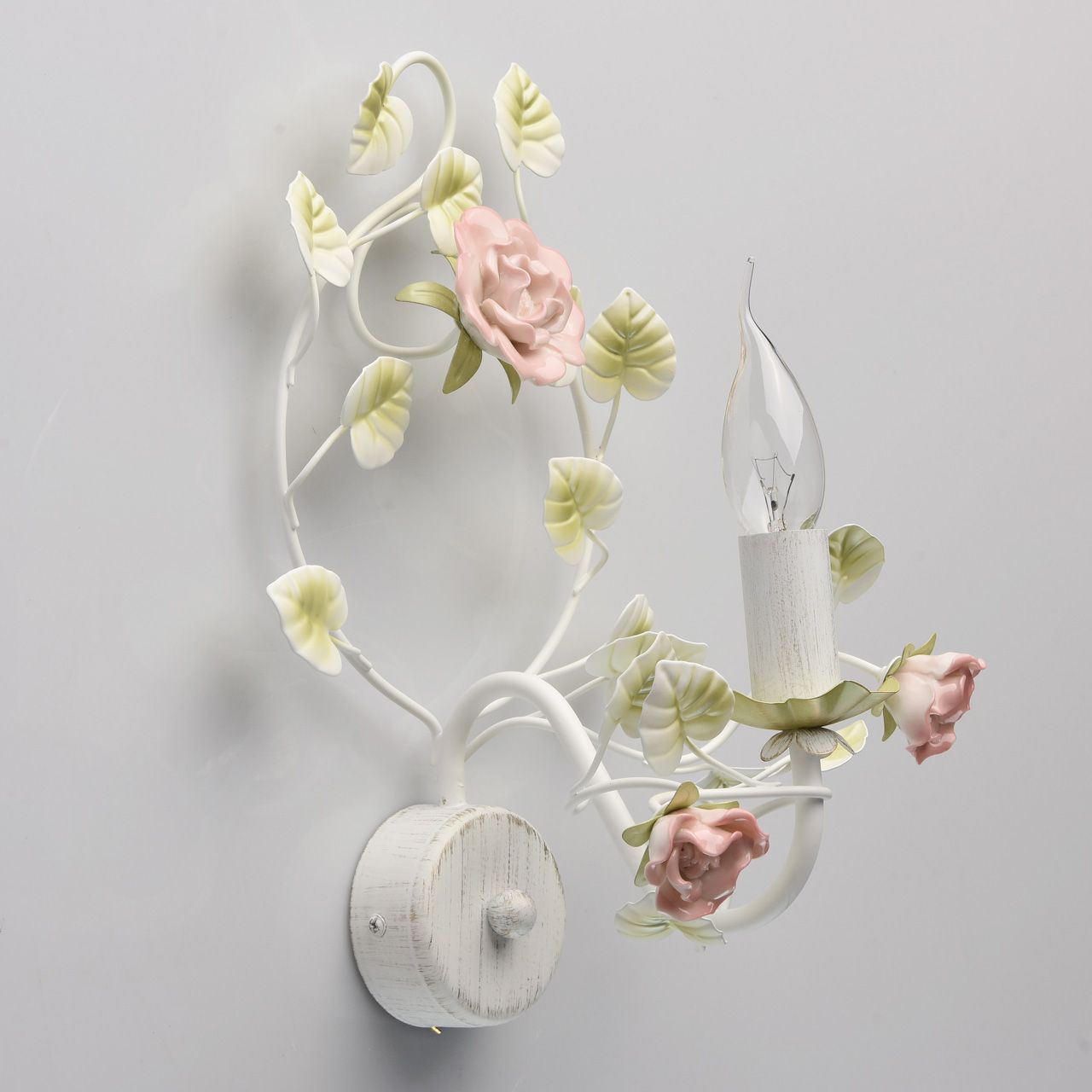 Основание: металл, обработка по технологии хай-лайт, основной слой белого матового цвета, декоративный слой цвета золота. Декоративная розетка: металл, прессование. Рожок: металл, прокат на роликовом станке. Декоративные элементы: металл, листья, выполнены по технологии прессования и окрашены вручную в зеленый цвет соответственно. Декор: цветы, выполненные из глазурированного фарфора с надглазурной росписью розового цветаТип помещения
