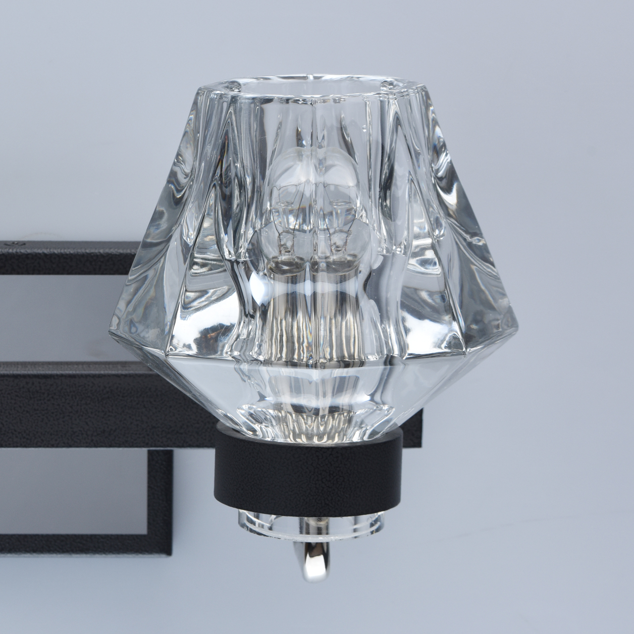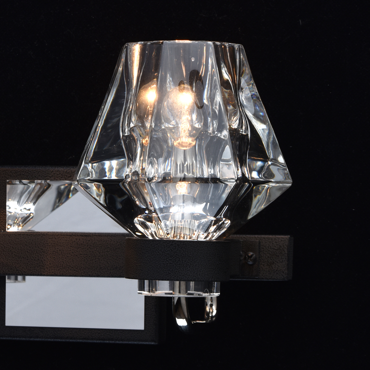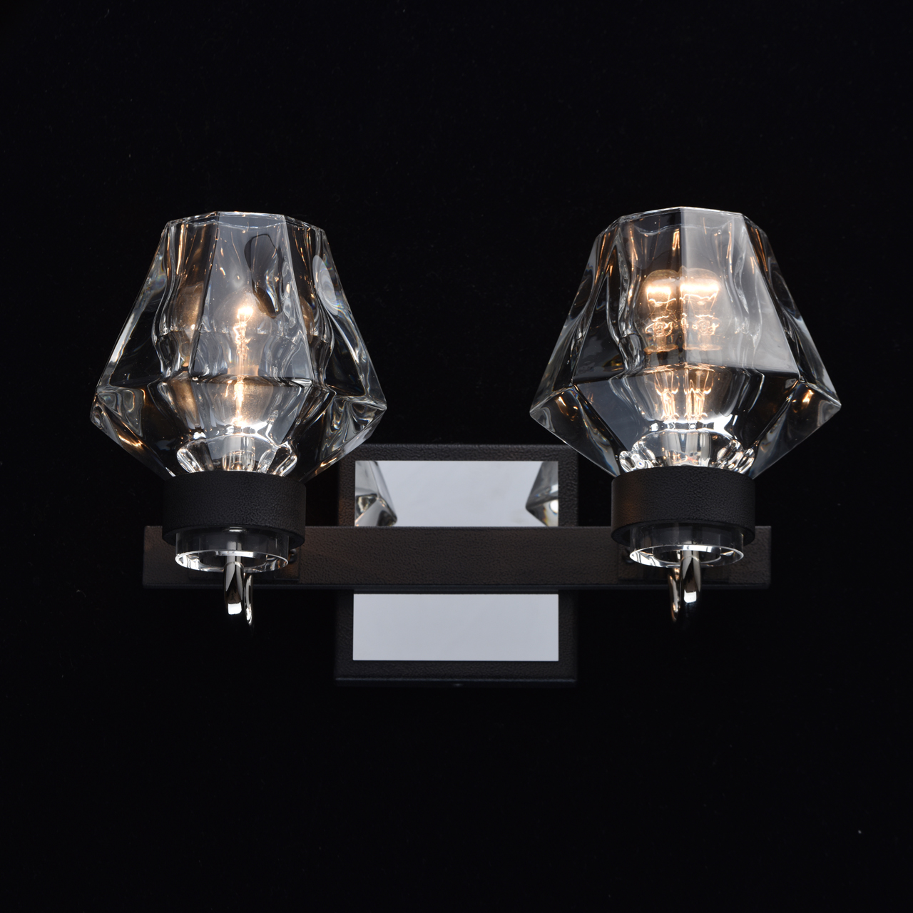 Основание бра выполнено из металла и обработано по технологии порошкового окрашивания с эффектом фактурной поверхности в черный матовый цвет. Держатели плафонов выполнены по технологии художественного литья. Рожки гальванизированы в цвет хрома. Плафоны отлиты из прозрачного стекла в сложную форму.Тип помещения