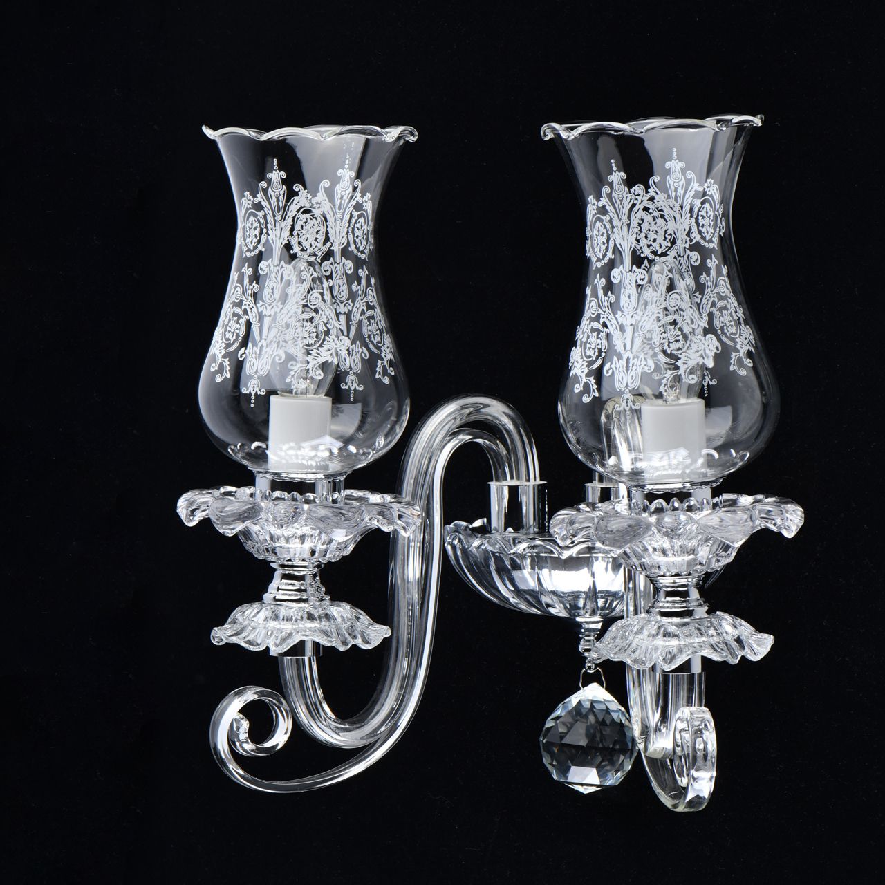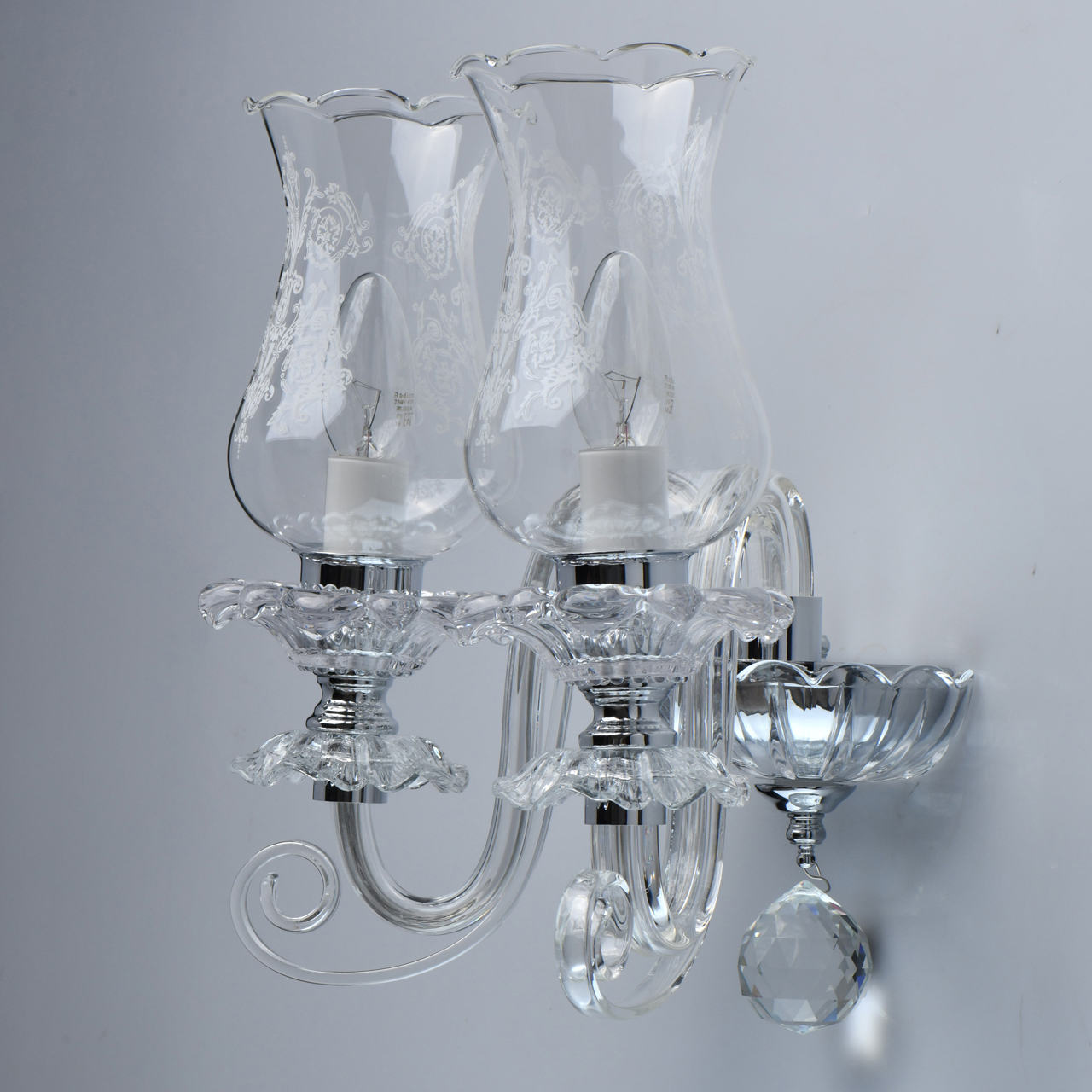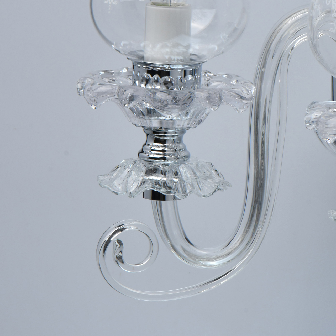 Основание/металл/цвет хрома/прозрачное стекло Плафоны/ стекло/ прозрачное с белым растительным орнаментом Декор/прозрачный хрустальТехнология производства