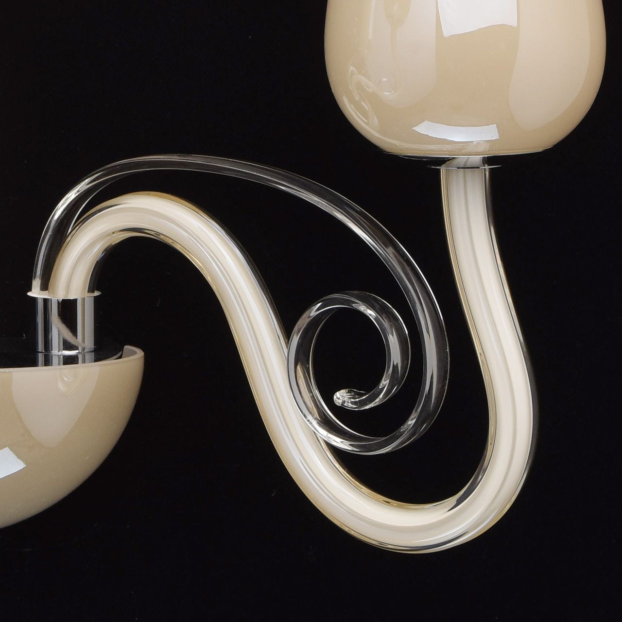 Металлическое крепление закрыто декоративными элементами из стекла, окрашенного в массе в жемчужный цвет. Рожки выполнены из дутого стекла, окрашенного изнутри. Рожки декорированы элементами из прозрачного гутного стекла ручной работы. Плафоны выполнены из стекла окрашенного в массе в жемчужный цвет и отлитого в форму.Тип помещения