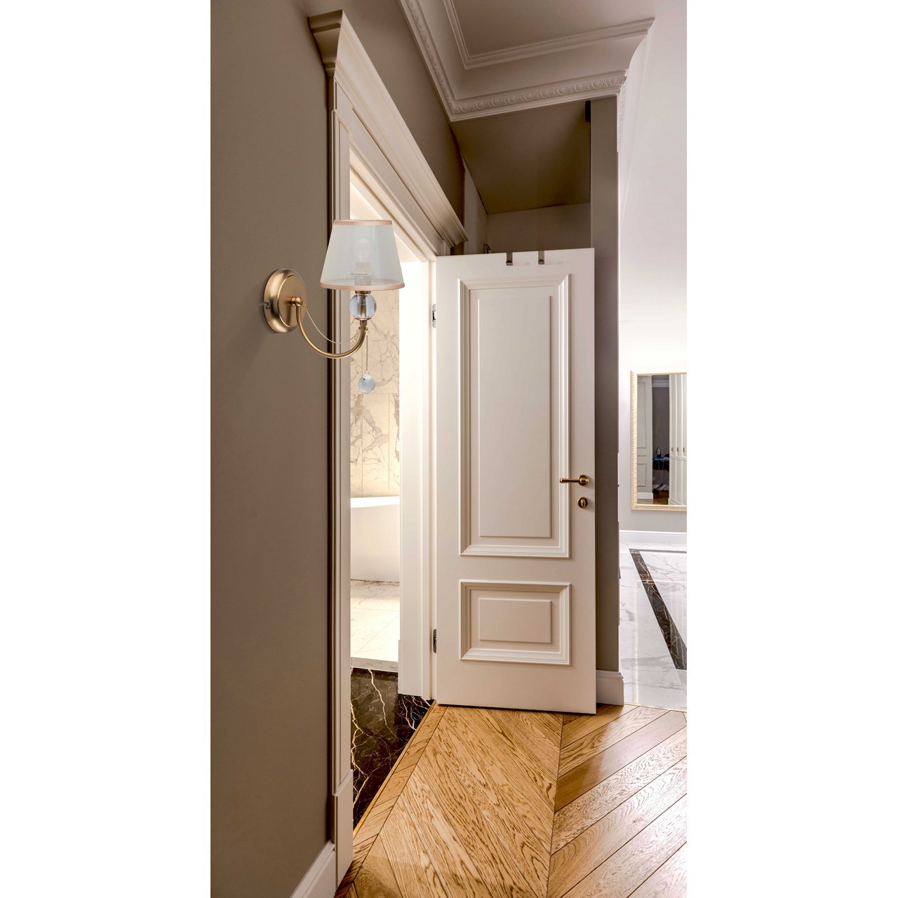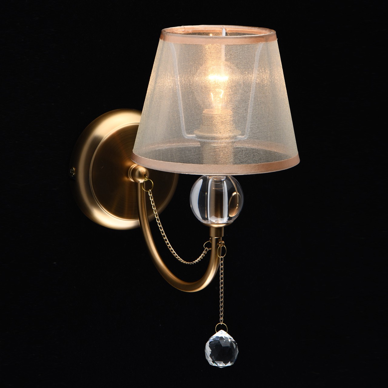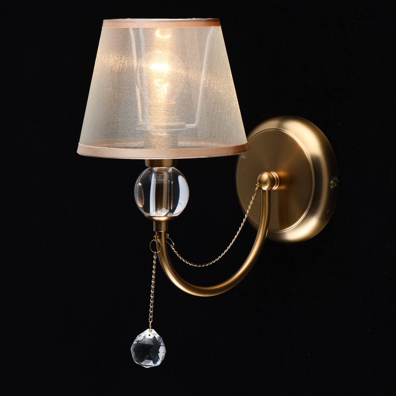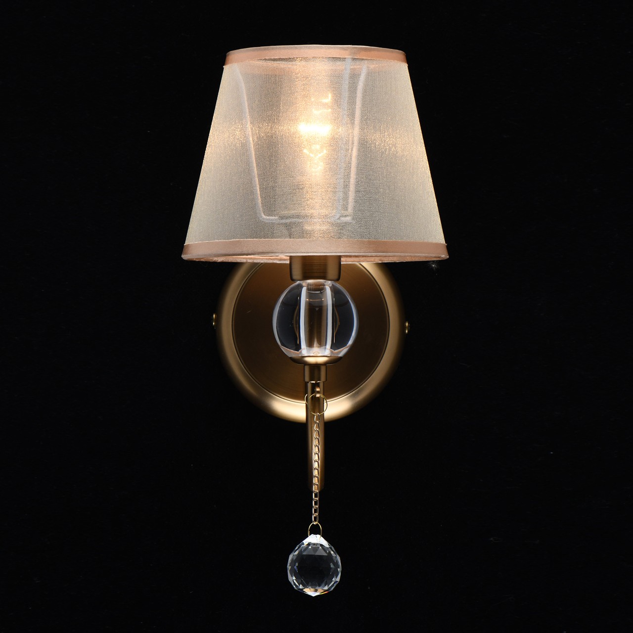 Основание бра выполнено из металла и гальванизировано в цвет золота с последующим матированием. Светильник декорирован текстильным абажуром из бежевой органзы с термостойким акрилом внутри. По краям абажур отделан кантом цвета золота. Рожок декорирован сферой из прозрачного акрила. Центральный подвес выполнен из хрусталя формы шар.Тип помещения