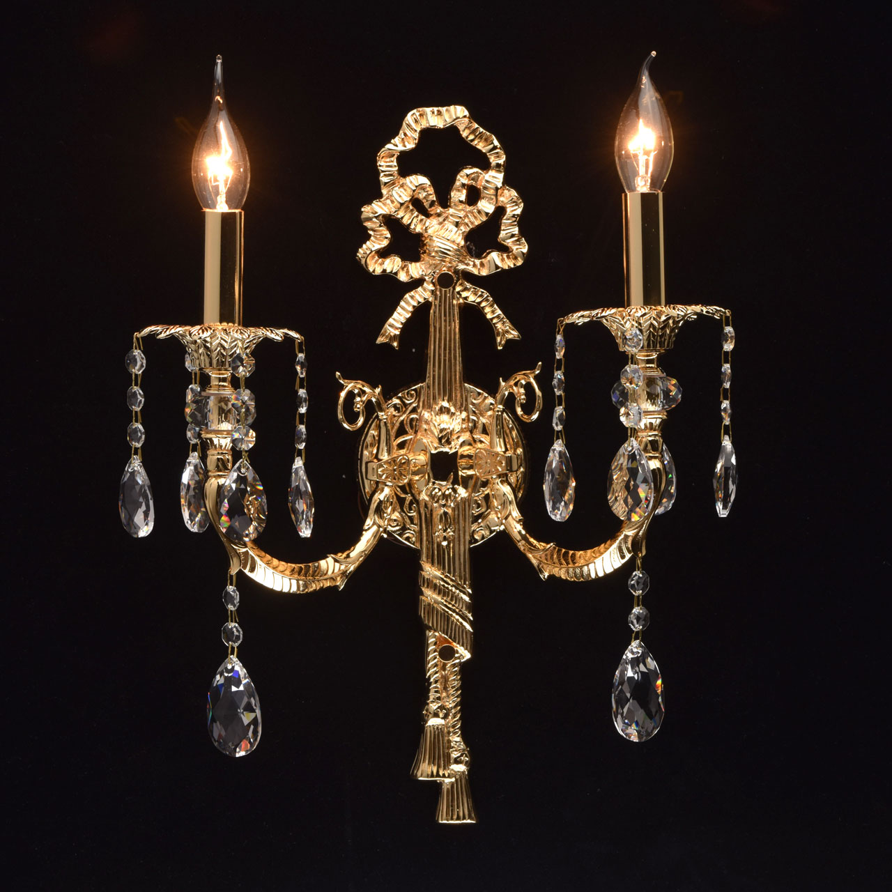 Бра из коллекции «Габриэль» - воплощение роскоши и изысканной красоты. Утонченное металлическое основание, выполненное из благородной латуни, гальванизировано в цвет золота оригинального оттенка. Грациозные витые рожки подчеркнуты изящными розетками, богатым резным декором и множеством крупных хрустальных подвесов из высококачественного хрусталя Asfour. Такой светильник достоин царских дворцов, но будет прекрасно смотреться и в соответствующее оформленном классическом интерьере.Стилевые решения интерьера