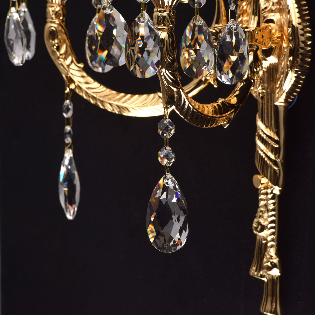 Основание: выполненo из латуни и гальванизировано в 4 слоя в цвет чистого золота: 1 слой - цвет бронзы, 2 слой - цвет никеля, 3 слой - цвет серебра, 4 слой - цвет золота, с последующим запеканием в печи при температуре 180 градусов. Рожки выполнены по технологии художественного литья. Декоративные розетки выполнены из латуни по технологии прессования и гальванизированы в цвет основания. Декор: декоративные розетки декорированы массивом хрусталя. Светильник декорирован прозрачным свинцовосодержащим хрусталем ТМ Asfour с содержанием оксида свинца 29%, формы октагон, миндаль и шар.Тип помещения