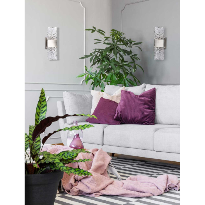 Цвет никеля добавляет современности к дизайну бра, придавая ему стильный и элегантный вид. Прозрачное фактурное стекло создает интересную игру света и тени. Светодиодные источники света обеспечивают яркость и энергоэффективность и безопасны в эксплуатации.Металлическое основание настенного бра гальванизировано в цвет никеля. Светодиодный источник света закрыт прозрачным фактурным стеклом, отлитым в сложную форму.