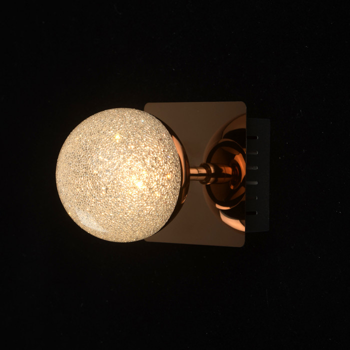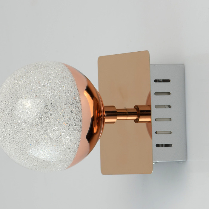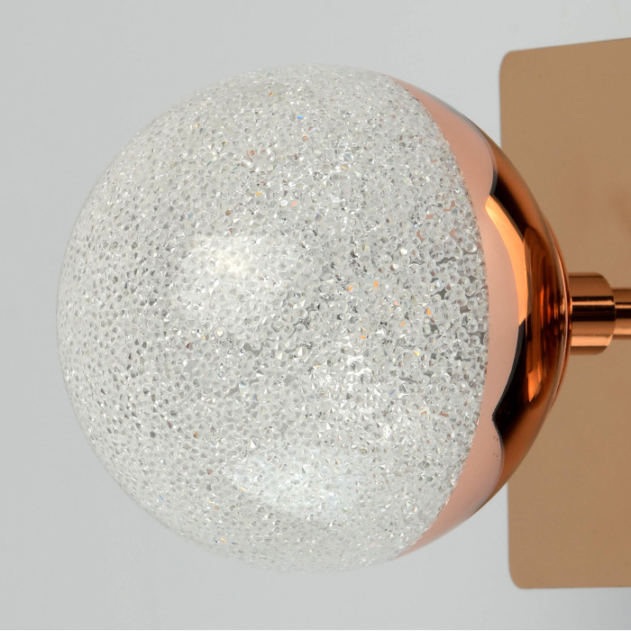 Оригинальный современный дизайн. Металлическое основание, корпус, рожки и держатели гальванизированы в цвет меди. Трендовый оттенок меди на пике популярности. Эффектные держатели плафонов из надежного сплава алюминия. Корпус выполнен из надежной нержавеющей стали. Отполированная до зеркального блеска поверхность корпуса отражает свет, усиливая его. Актуальное решение для зональной подсветки современного интерьера. Оригинальные закрытые плафоны-сферы изнутри декорированы стеклянной крошкой, создается эффект драгоценного камня. Светодиодные источники света типа СОВ долговечны и экономичны, обеспечивают ровный свет, без мерцаний. Идеальное соотношение цена/качество. Семья дополнена потолочным светом, есть возможность комплексной подсветки интерьера.Основание гальванизировано в цвет меди: рожок из металла, держатель плафона из сплава алюминия, корпус выполнен из нержавеющей стали. Плафон из стекла, изнутри декорирован стеклянной крошкой. Светодиодный источник света типа COB.