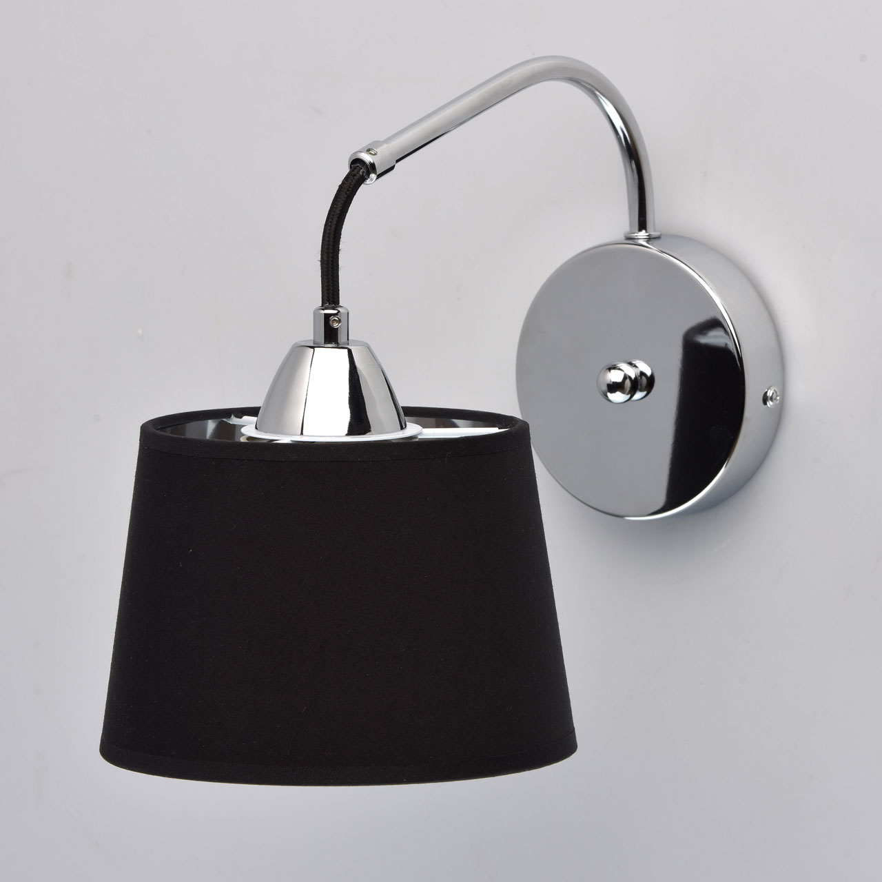 Основание: металл, гальванизировано в цвет хрома. Абажур: двухслойный абажур с текстилем матового чёрного цвета снаружи и акрилом цвета хром с зеркальным эффектом изнутри. Декор: текстильный шнур черного цвета.Тип помещения