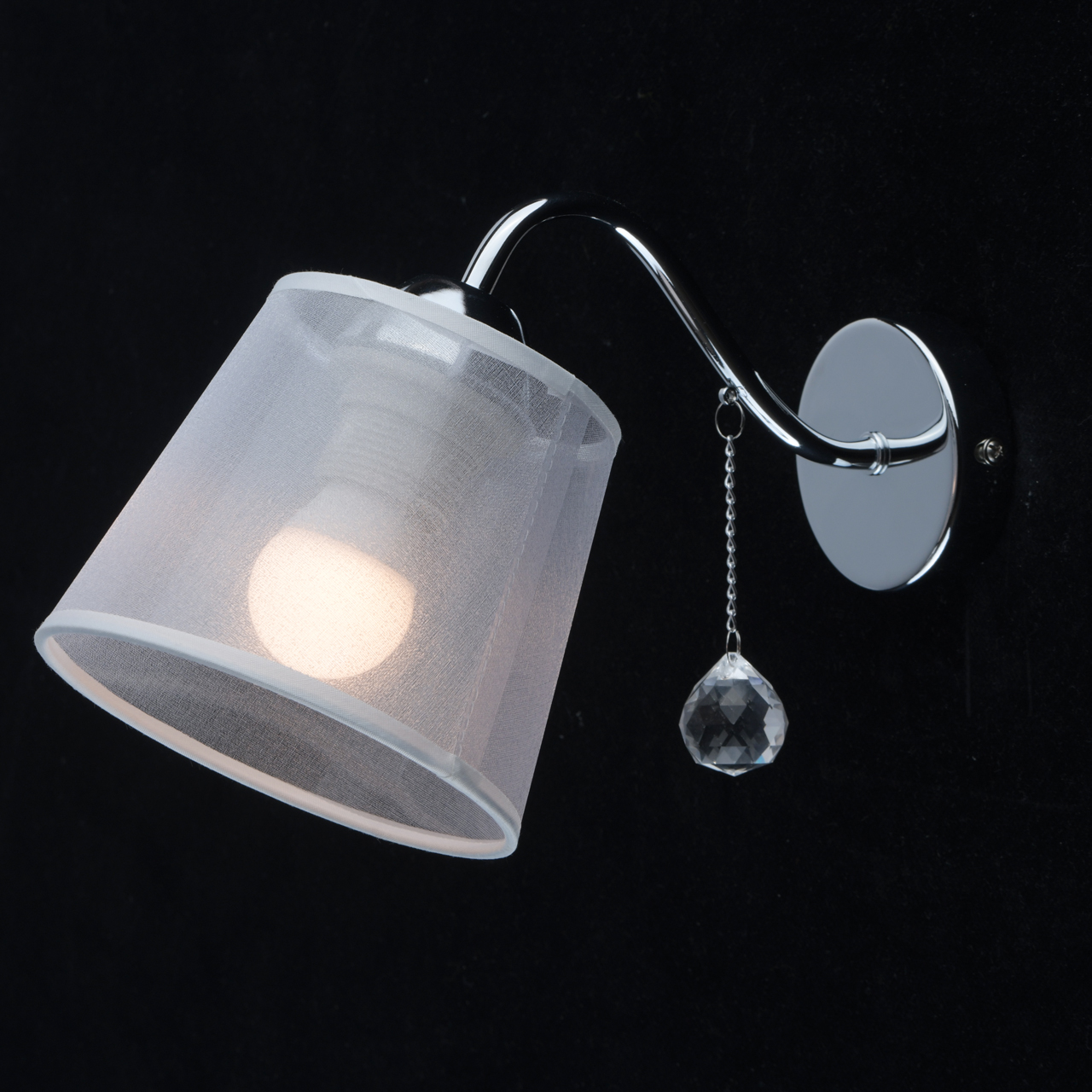 Основание бра выполнено из сплава металла и гальванизировано в цвет хрома. Абажур из прозрачной органзы белого цвета с термостойким акрилом внутри. Абажур отделан кантом сверху и снизу, прошит. Декор бра - металлическая цепочка цвета основания и прозрачный хрусталь в форме шара.Тип помещения