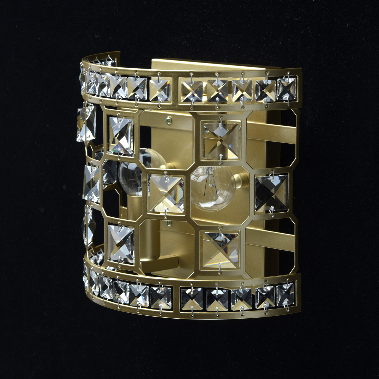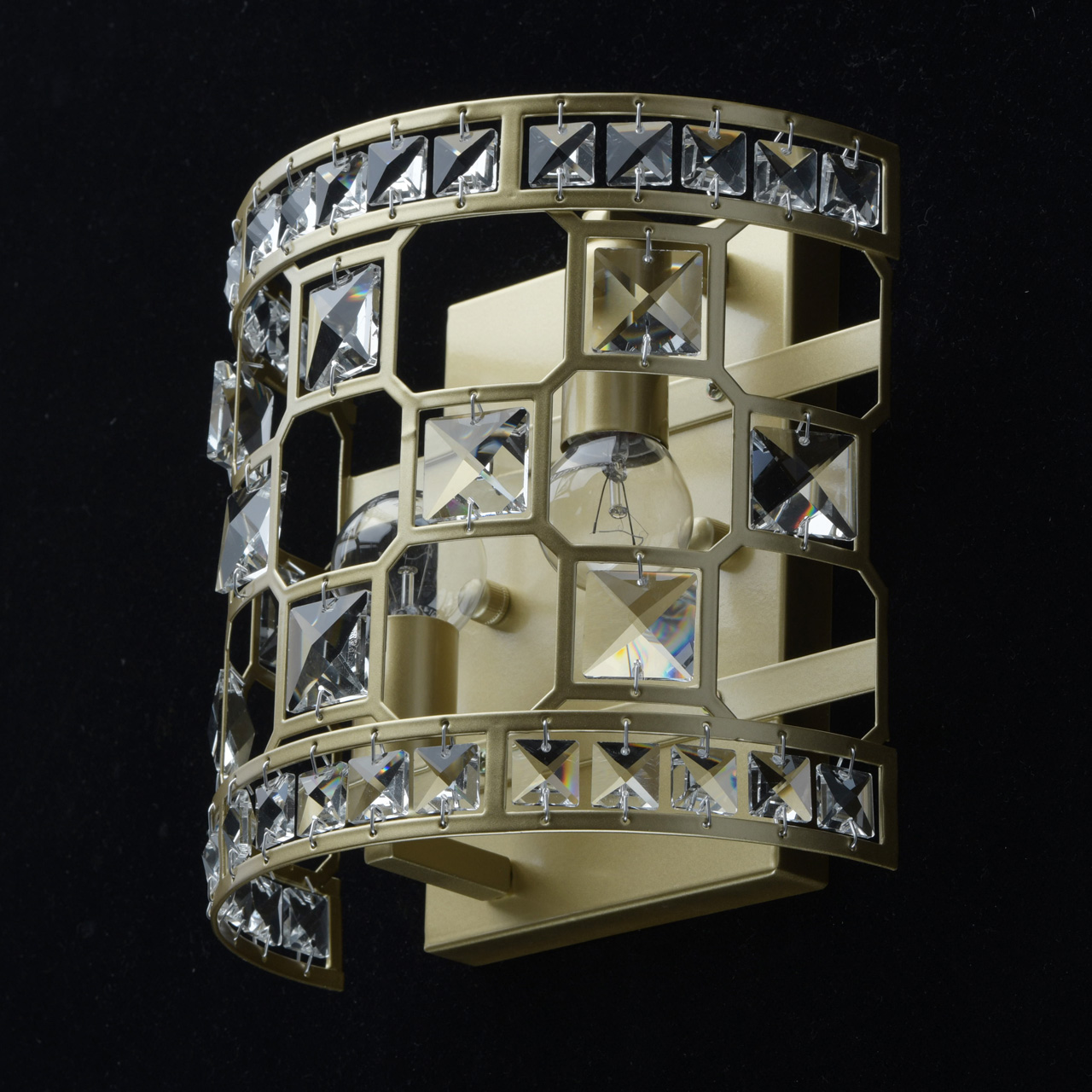 Основание светильника выполнено из металла и окрашено в цвет перламутрового золота. Декоративный плафон выполнен по технологии лазерной резки. Светильник декорирован прозрачным хрусталем квадратной формы.Тип помещения