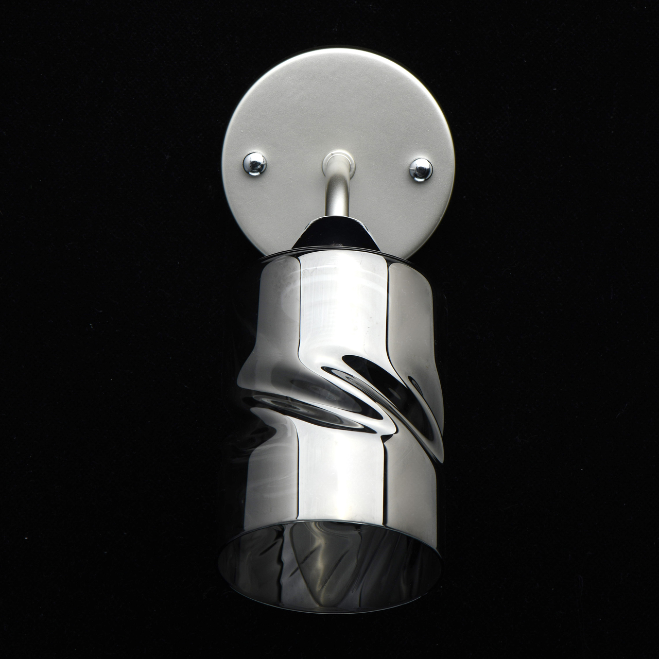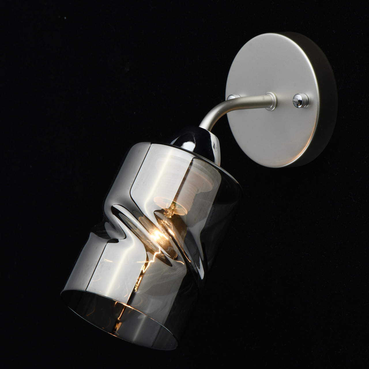 Металлическое основание бра окрашено в цвет перламутрового серебра. Отдельные элементы основания гальванизированы в цвет хрома. Стеклянный плафон отлит в сложную перекрученную форму и гальванизирован в дымчатый цвет.Тип помещения