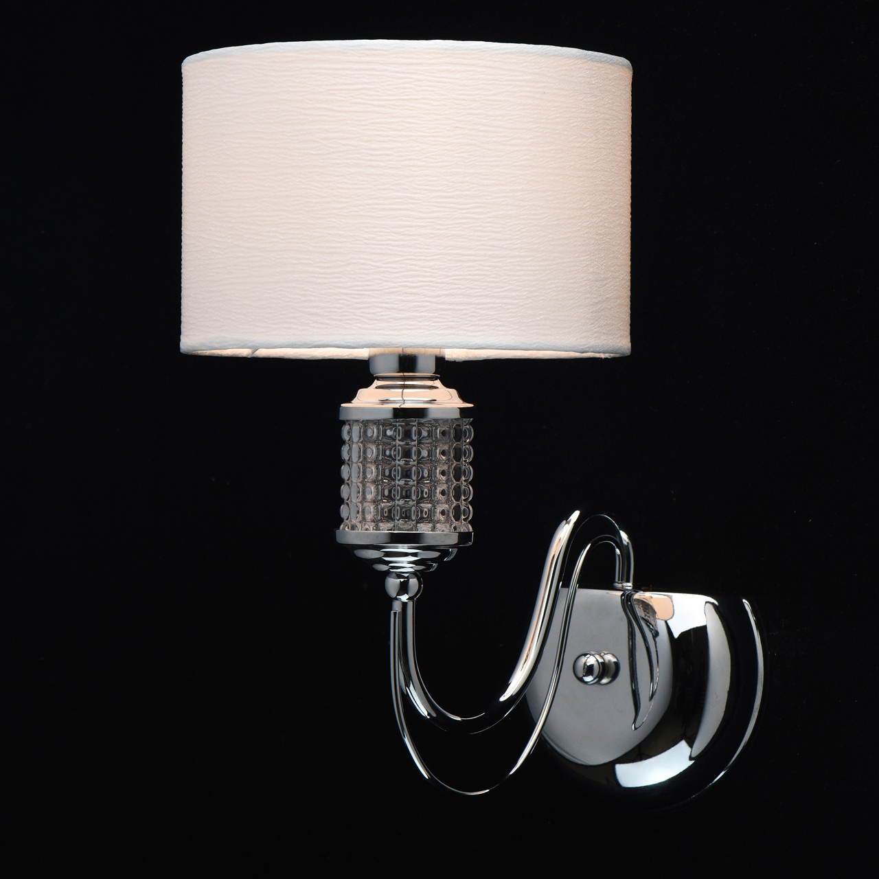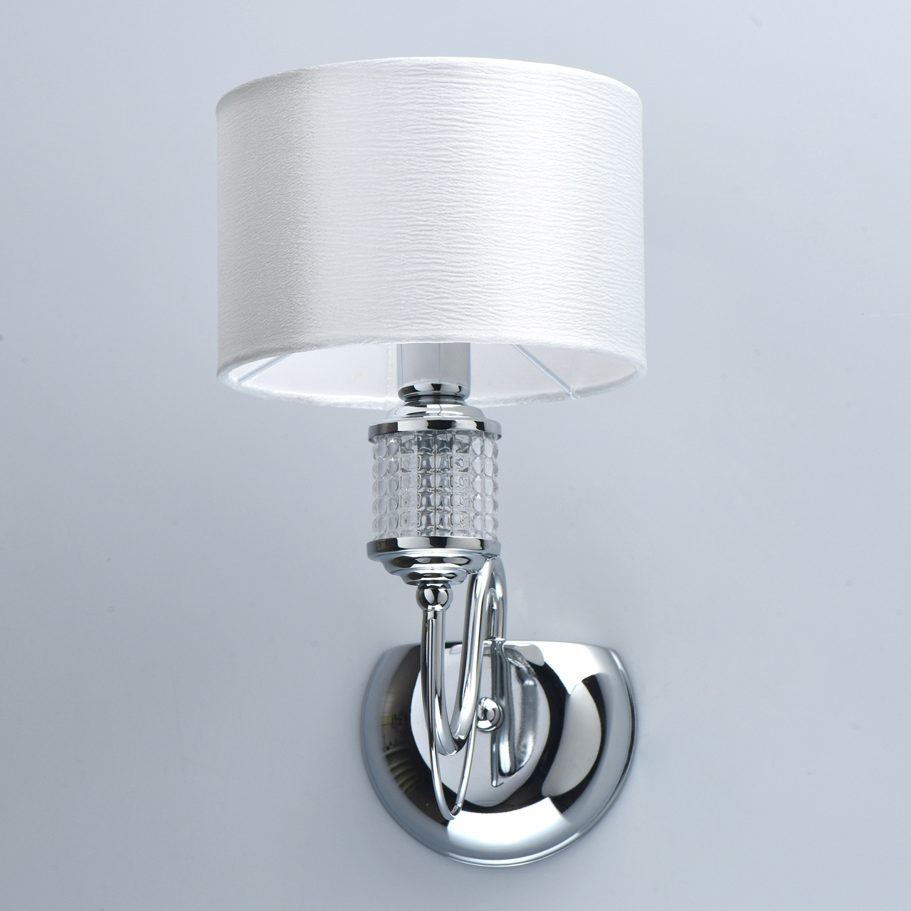 Основание светильника выполнено из металла и гальванизировано в цвет хрома. На рожке используется декор из стекла сложной формы. Светильник декорирован текстильным абажуром белого цвета с термостойким акрилом внутри. Абажур прошит и отделан кантом.Тип помещения