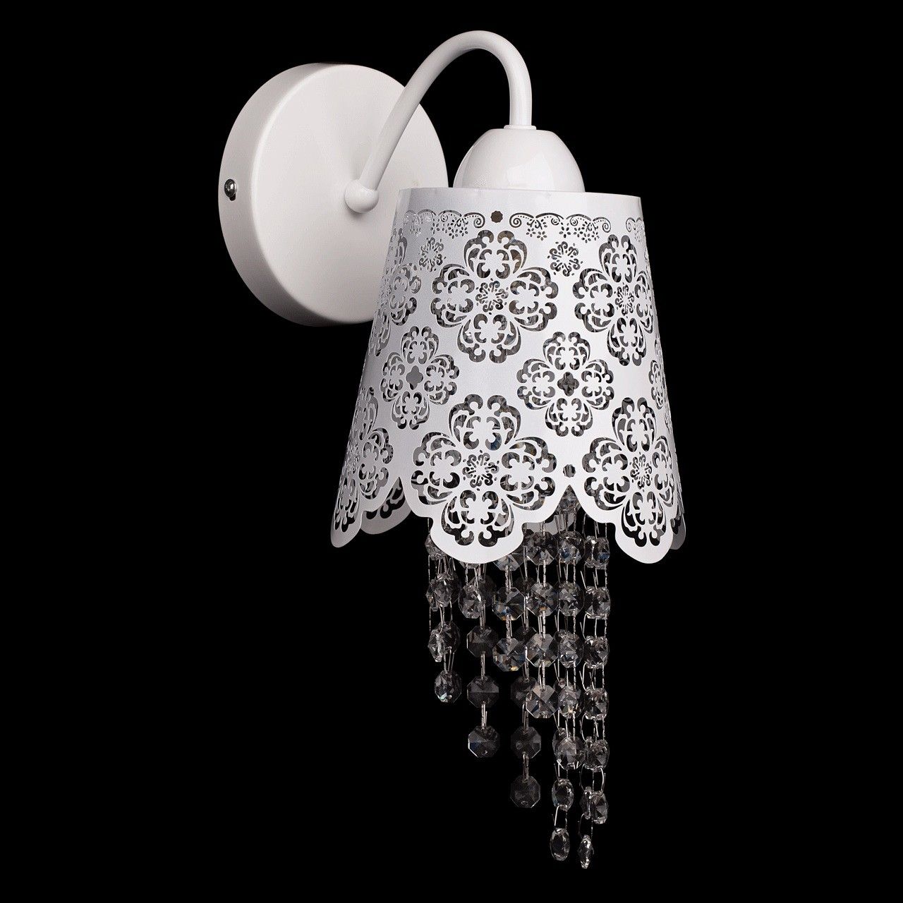 Арматура бра выполнена из сплава железа и окрашена в белый глянцевый цвет. Перфорированный плафон выполнен из сплава железа по технологии лазерной резки и окрашен в цвет арматуры. Светильник декорирован подвесками из хрусталя формы октагон сложной огранки.Тип помещения