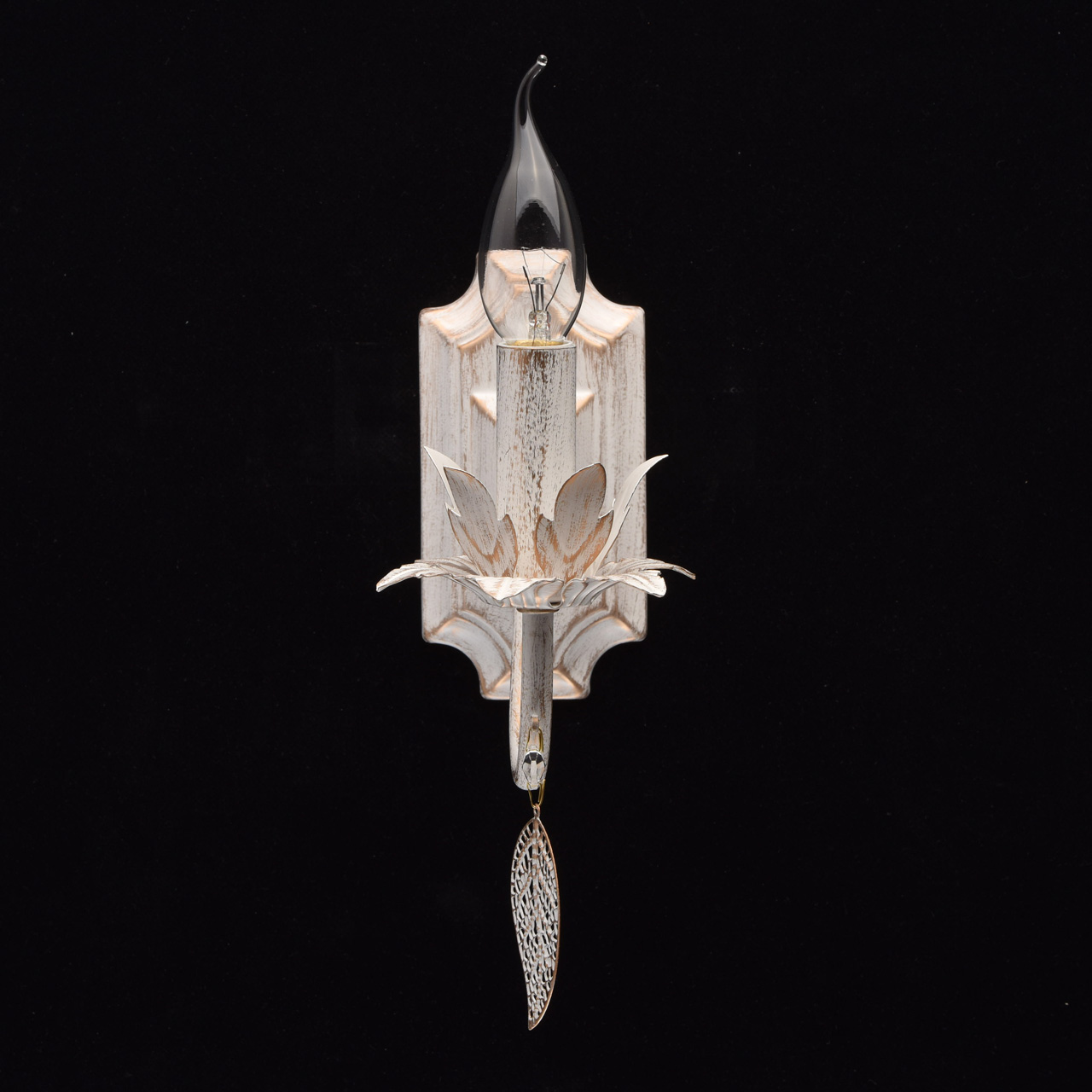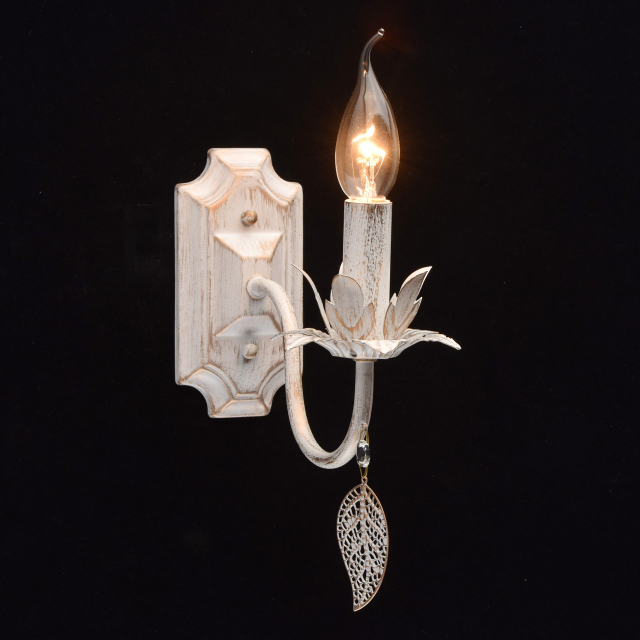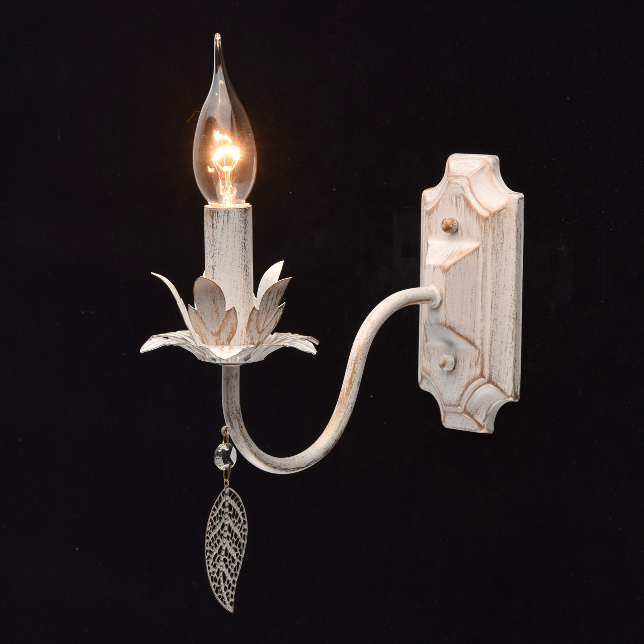 Металлическое основание окрашено в цвет слоновой кости с золотой патиной. Декор: подвеска в виде листа, хрусталь.Технология производства