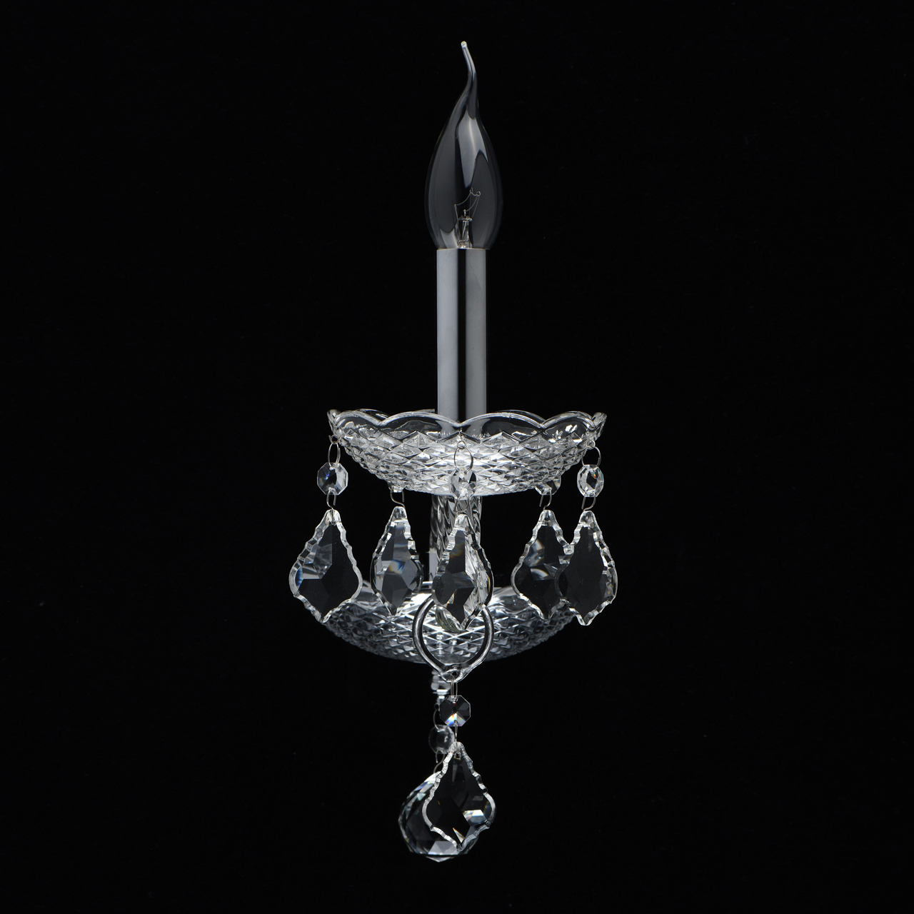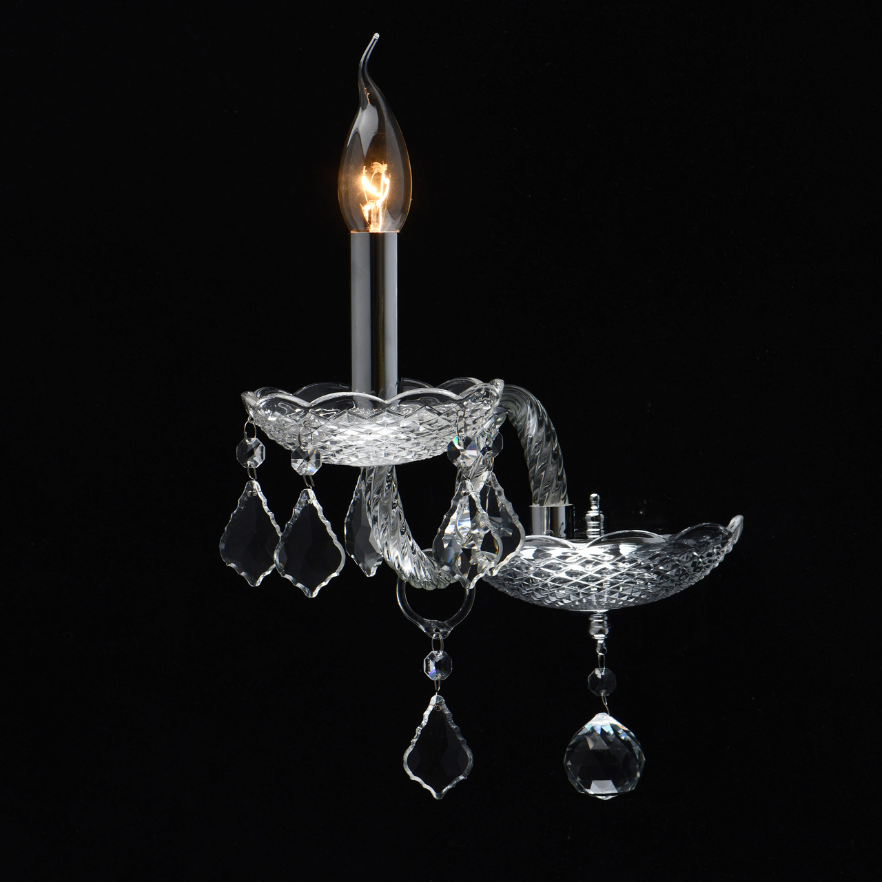 Основание бра выполнено из металла и гальванизировано в цвет хрома. Рожок выполнен из стекла гутным способом. Основание декорировано прозрачным стеклом, отлитым в сложную форму. Светильник декорирован прозрачным хрусталем формы октагон и дубовый лист.Тип помещения