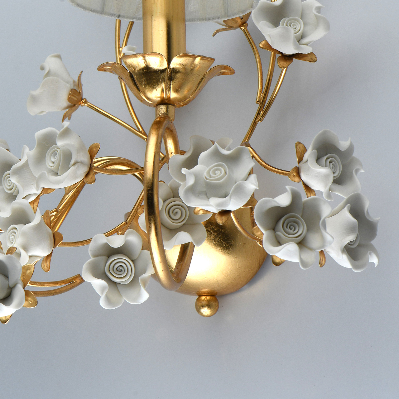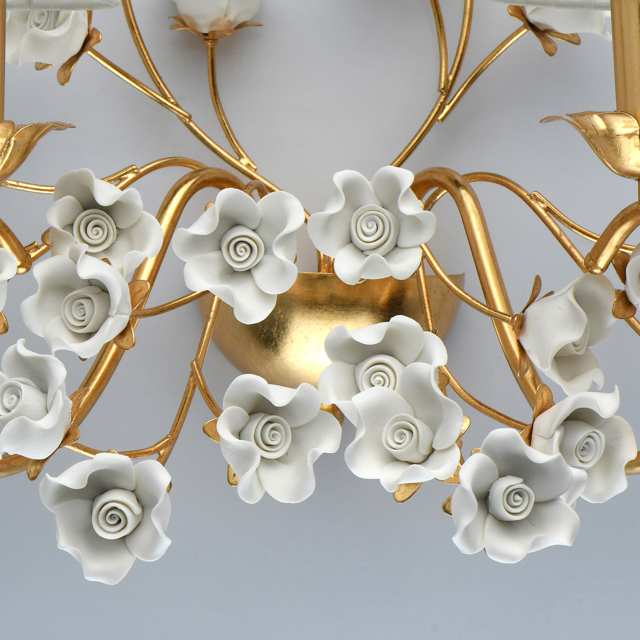 Основание светильника выполнено из металла и покрыто сусальным золотом. Светильник декорирован цветами ручной работы из неглазурированного фарфора белого цвета.Тип помещения