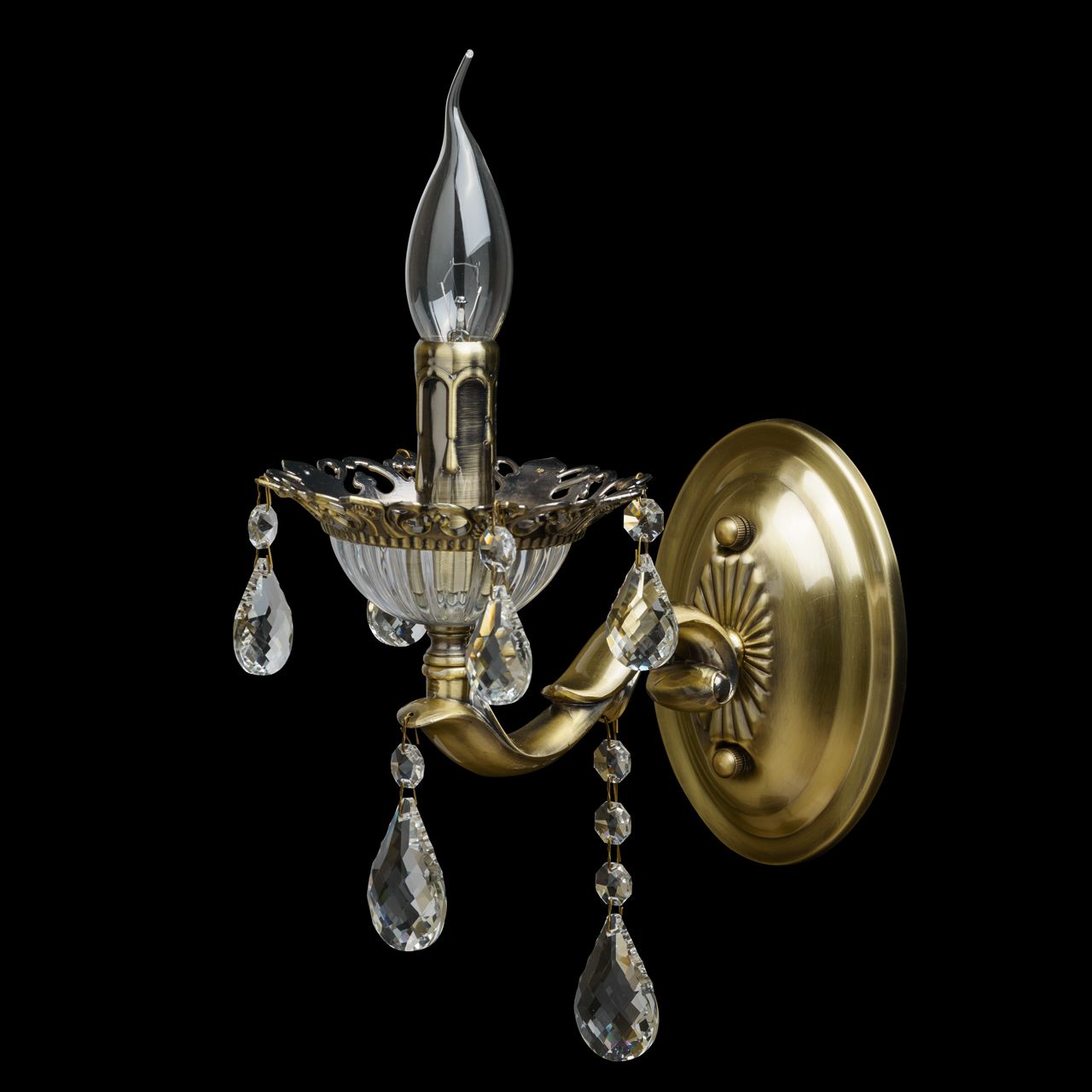 Арматура бра выполнена из комбинации сплавов металлов и гальванизирована в цвет античной бронзы с последующим патинированием и лакированием. Основание светильника выполнено из сплава железа по технологии прессования. Рожок и декор розетки выполнены из сплава алюминия с цинком по технологии художественного литья в кокиль под давлением. Розетка выполнена из стекла, отлитого по форме. Светильник декорирован подвесками из хрусталя категории "a-grade" сложной огранкиТип помещения