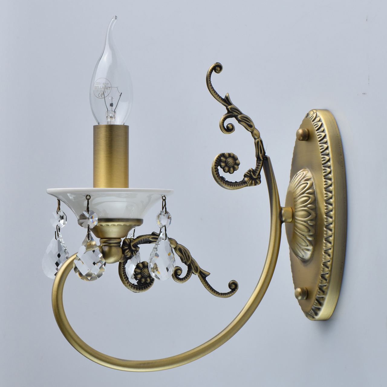 Основание светильника гальванизировано в цвет бронзы и патинировано. Декоративные элементы выполнены по технологии художественного литья. Декоративные розетки и центральная ось выполнены из белого глазурированного фарфора. Светильник декорирован прозрачным хрусталем.Тип помещения