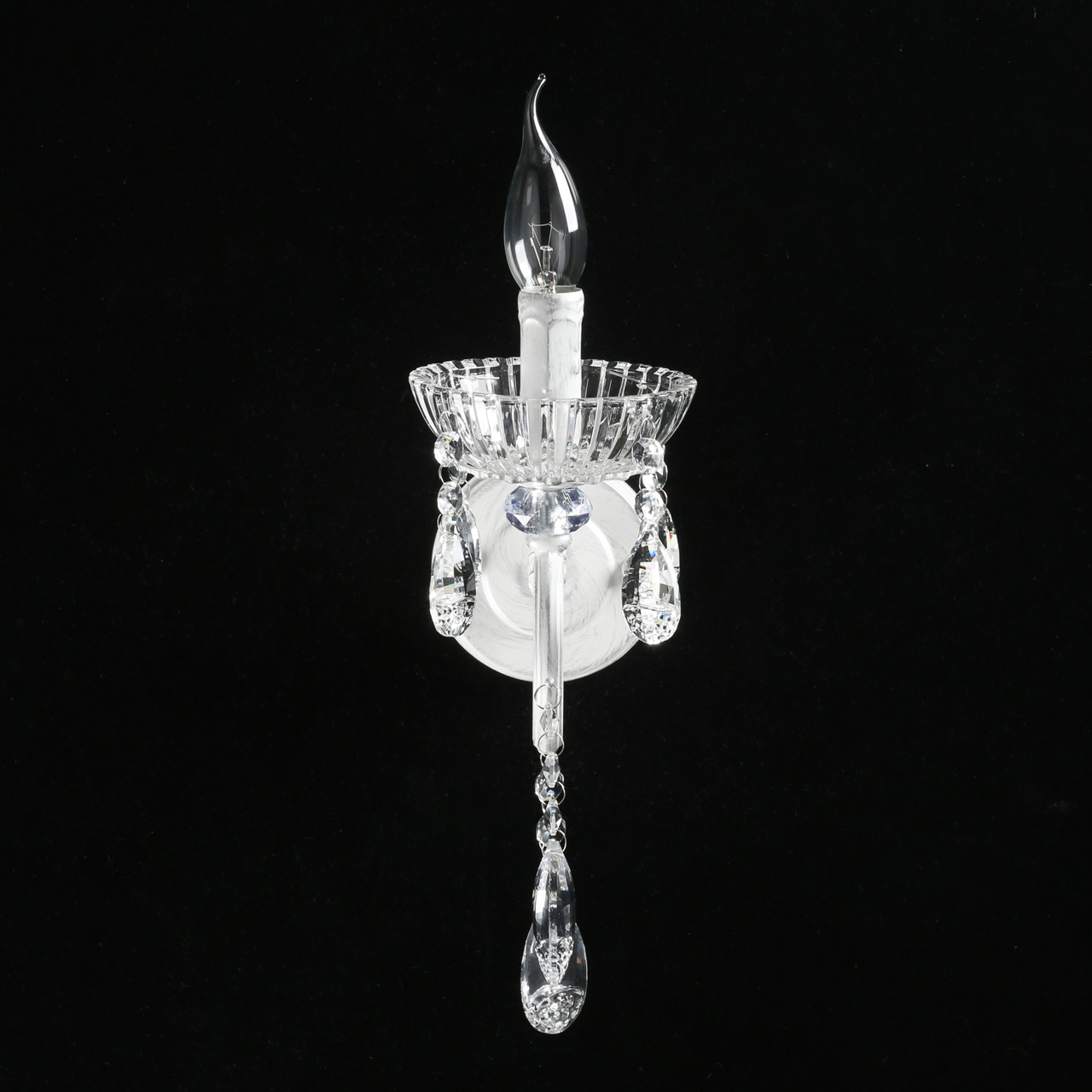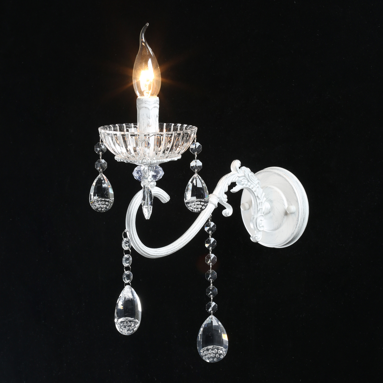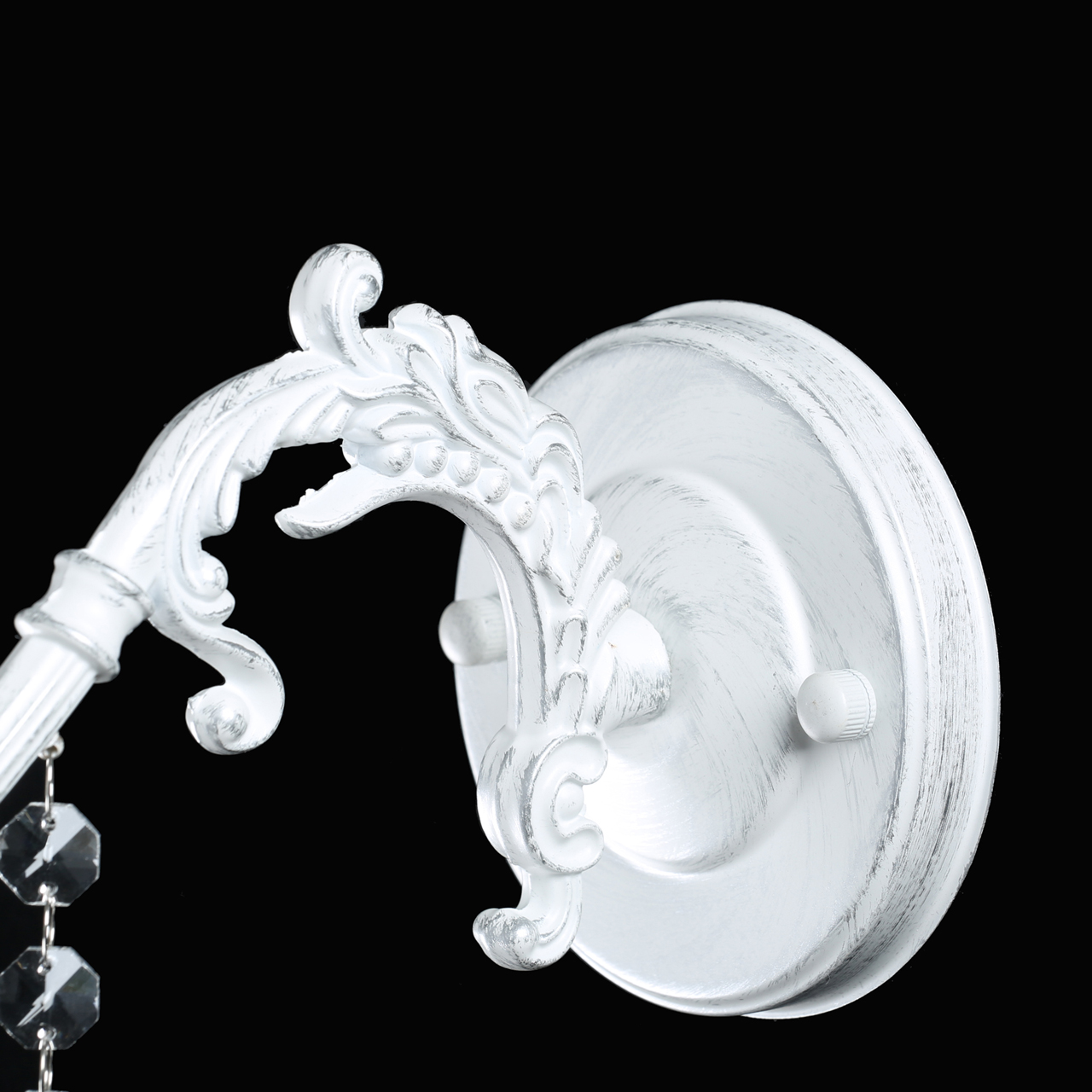 Основание светильника обработано по технологии хай-лайт, где основной слой белого цвета, а декоративный - цвета серебра. Рожок выполнен по технологии художественного литья из сплава алюминия. Декоративная розетка выполнена из прозрачного стекла. В нижней части розетка декорирована элементом из прозрачного акрила. Светильник декорирован прозрачным хрусталем формы миндаль с насечками, выполненными алмазным резцом.Тип помещения