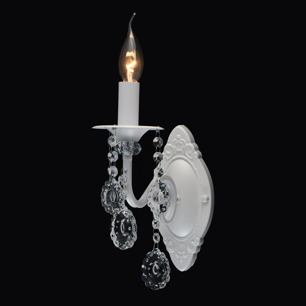Основание светильника выполнено из металла и окрашено в белый цвет. Светильник декорирован прозрачным хрусталем оригинальной формы.Тип помещения