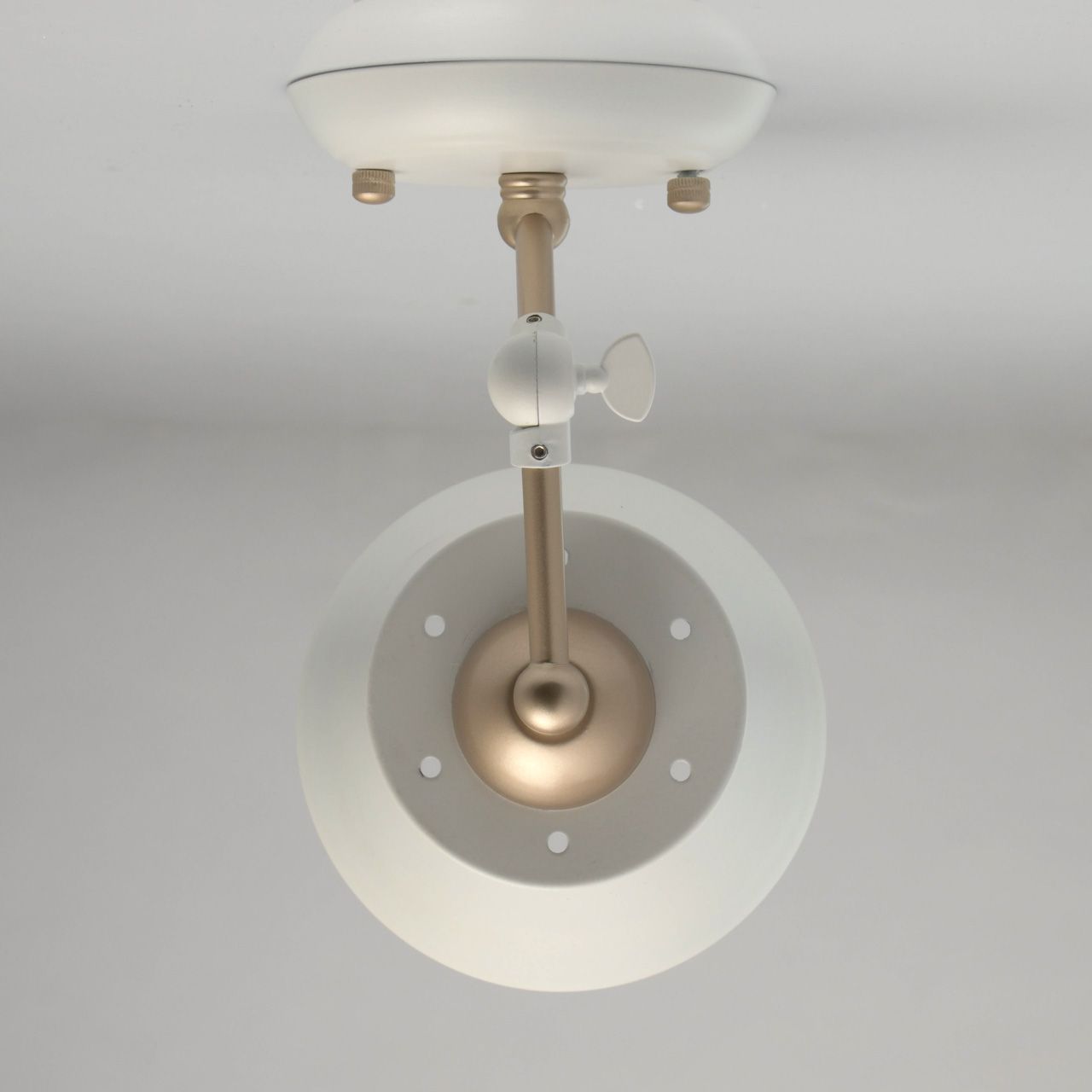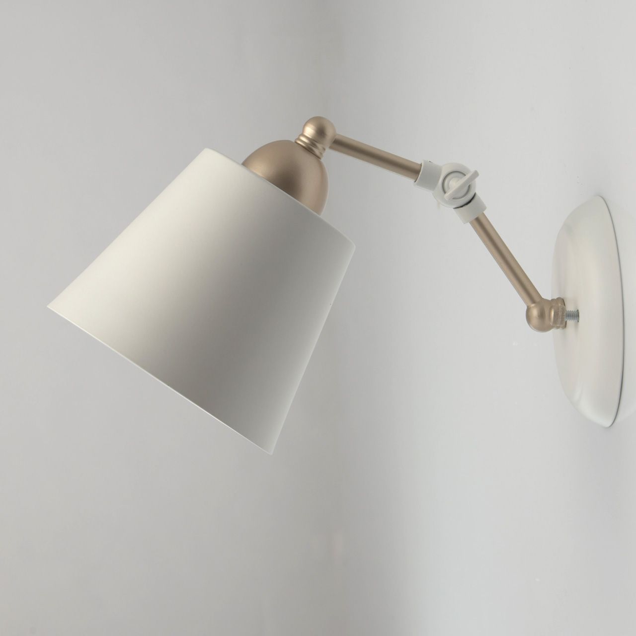 Основание светильника выполнено из металла и окрашено в белый и серебристый цвет. Основание: обработка на токарном станке. Рожок: оснащен фиксатором, с возможностью поворота. Плафон: металл, внутренняя часть окрашена в белый глянцевый цвет.Тип помещения