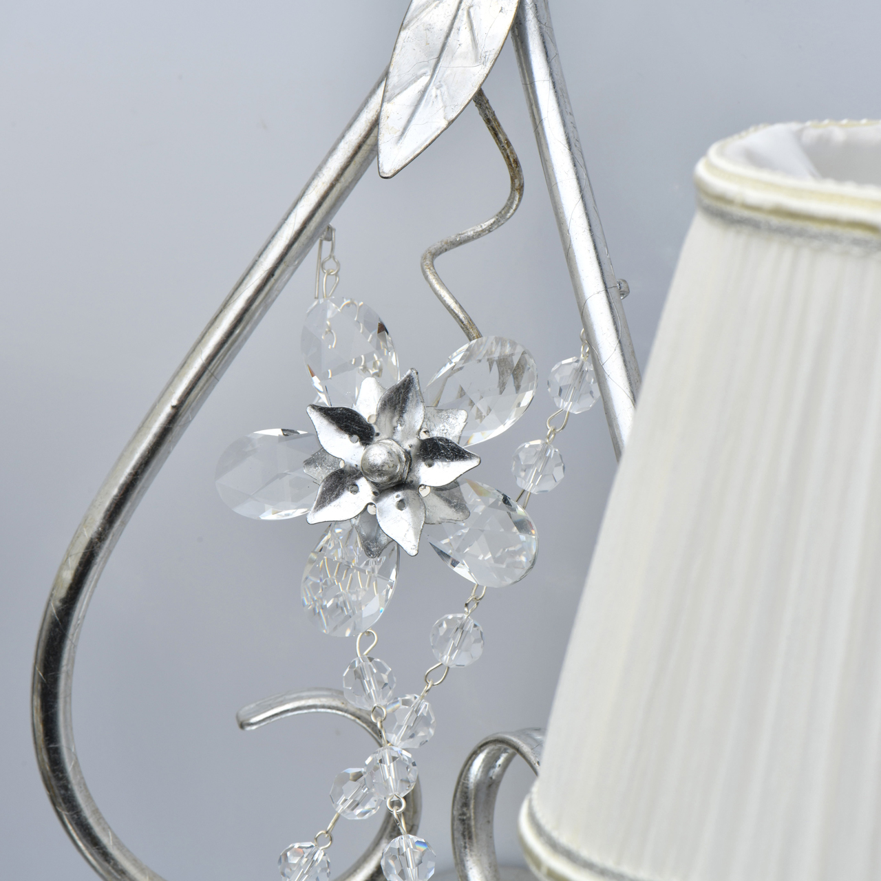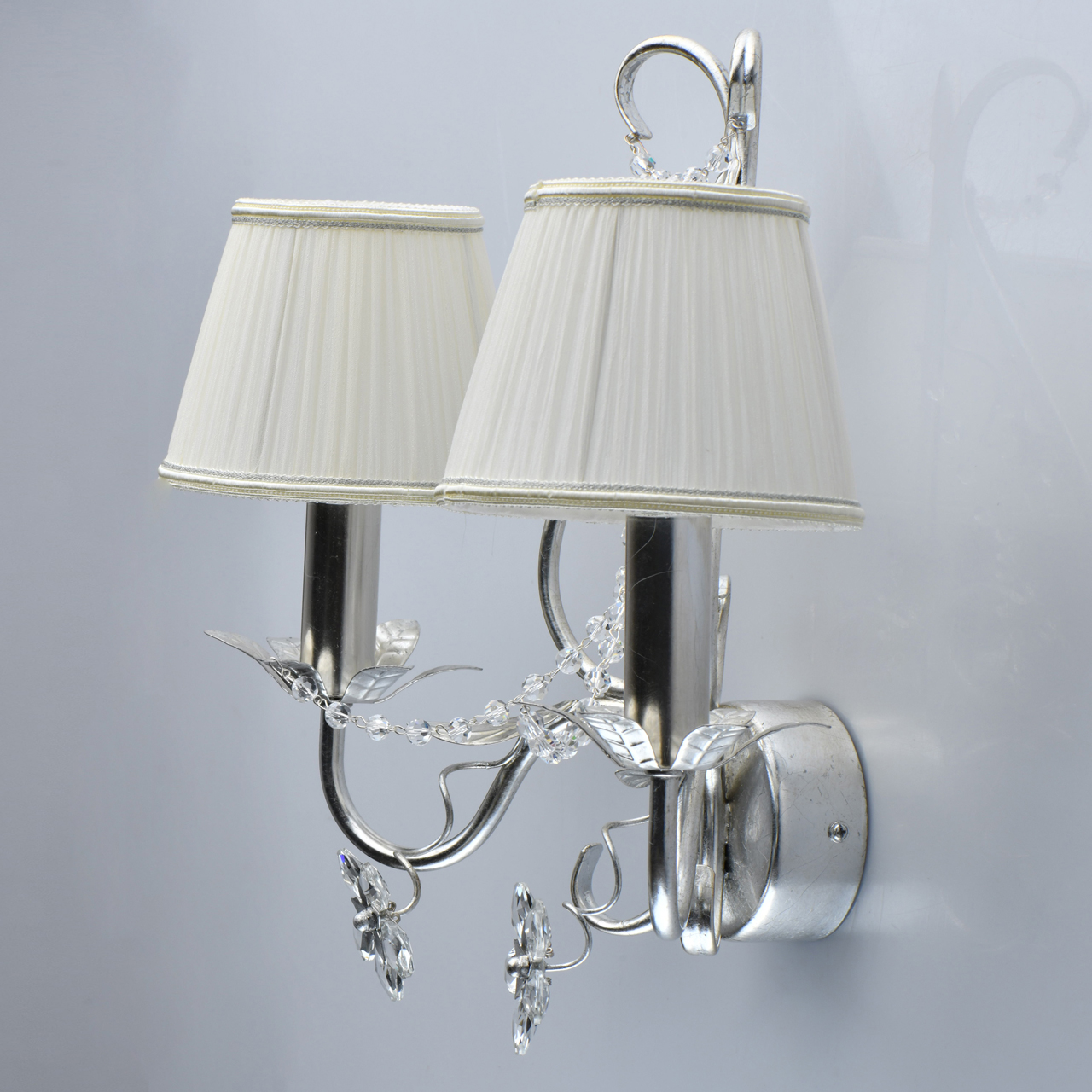 Основание светильника выполнено из металла и обработано по технологии сусального покрытия серебром. Текстильные абажуры молочного цвета отделаны кантом.Тип помещения