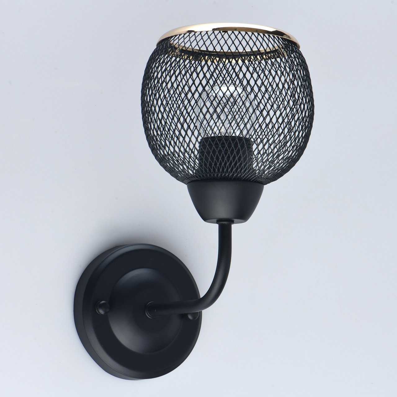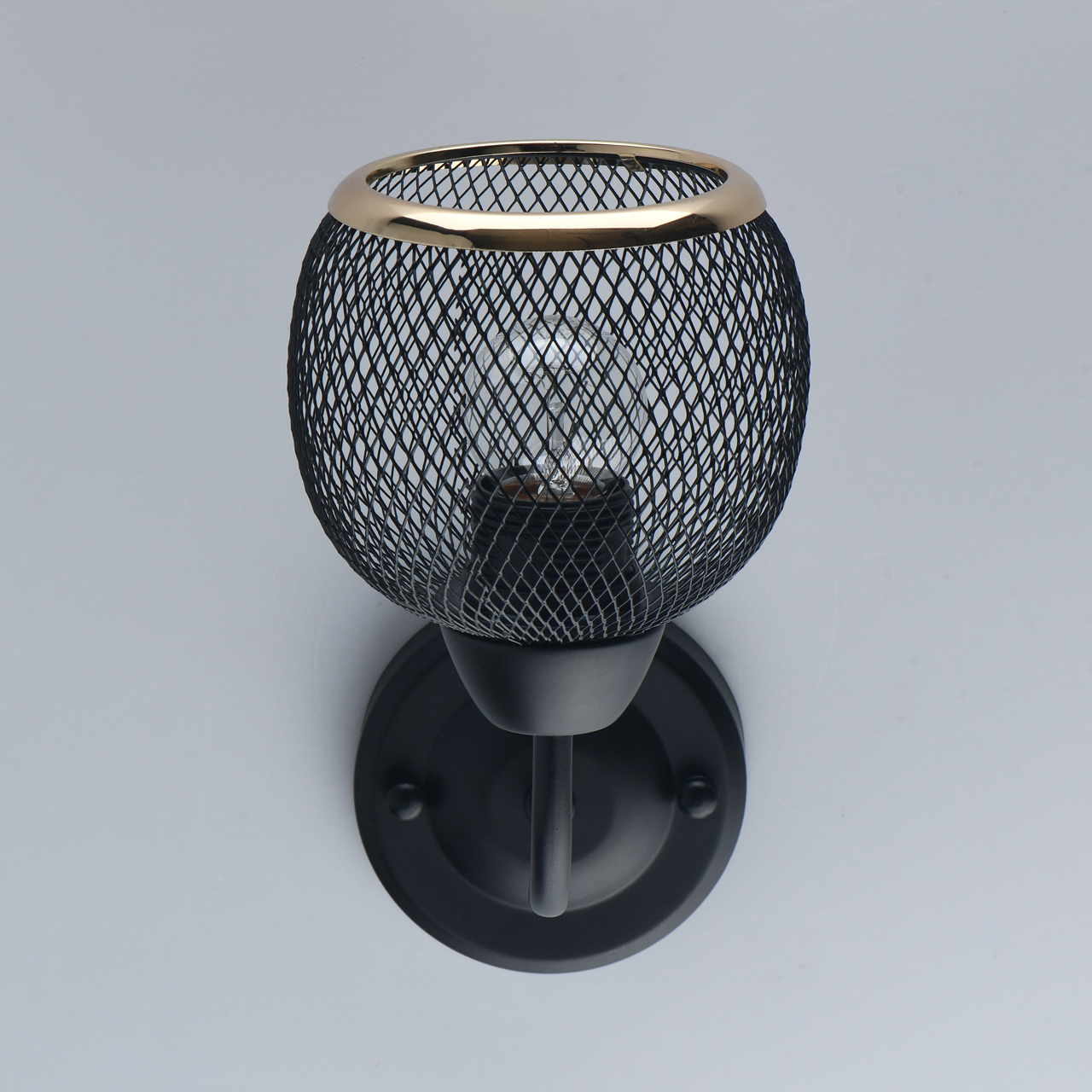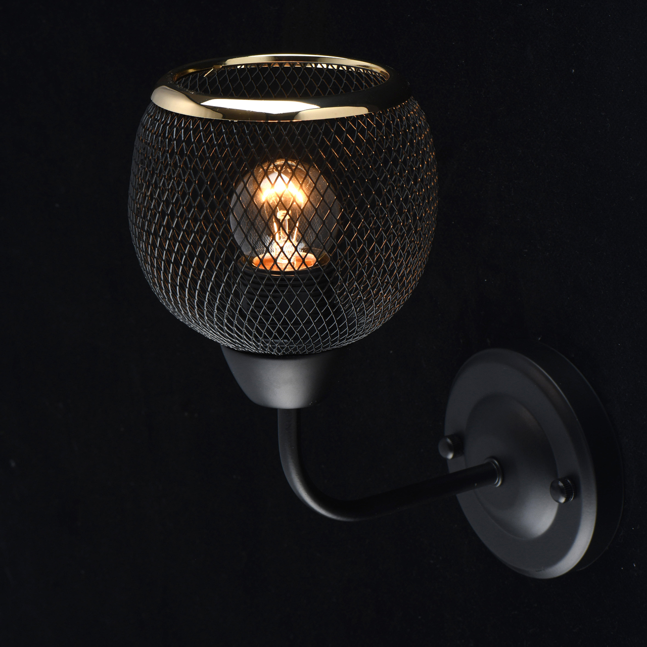 Основание светильника выполнено из металла и окрашено в черный цвет. Плафон выполнен в виде сетки. Край плафона отделан металлическим кантом, гальванизированным в цвет золота.Тип помещения