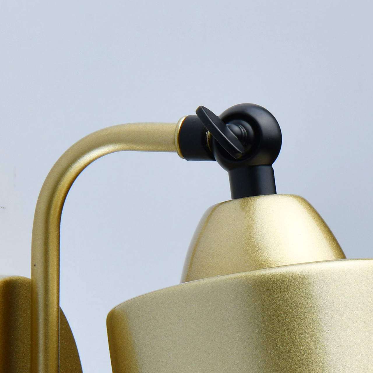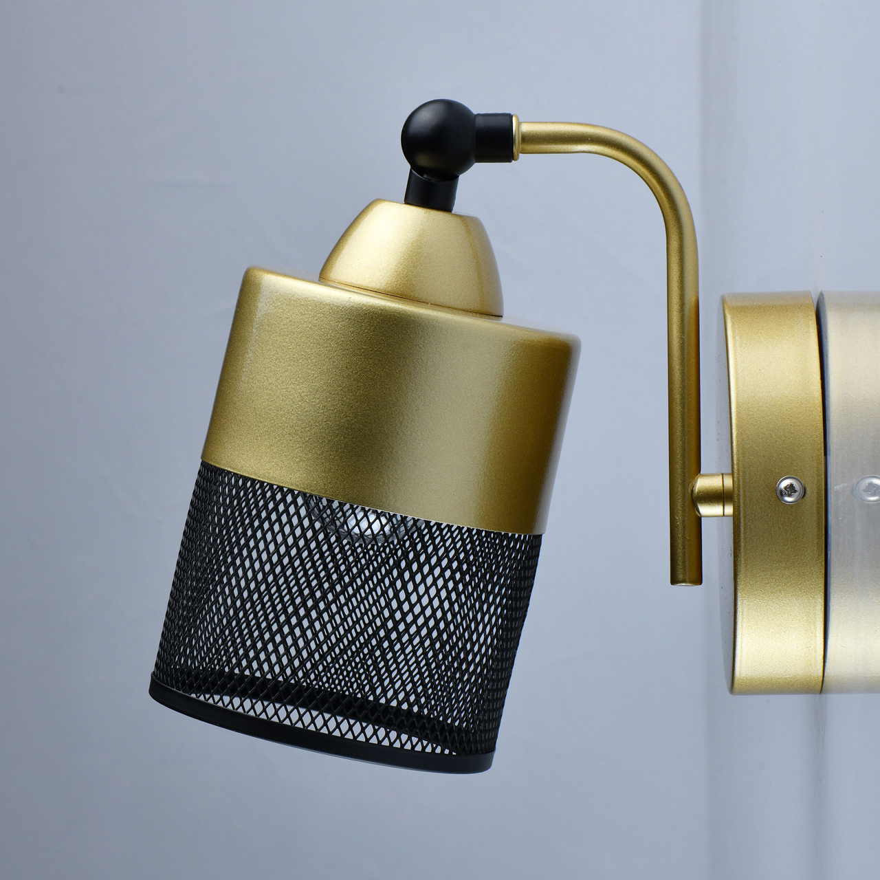 Основание светильника выполнено из сплава металла и окрашено в цвет перламутрового золота. Плафон из сплава металла выполнен в виде сетки и окрашен в черный цвет. Также в черный цвет окрашен шарнир для поворота плафона.Тип помещения