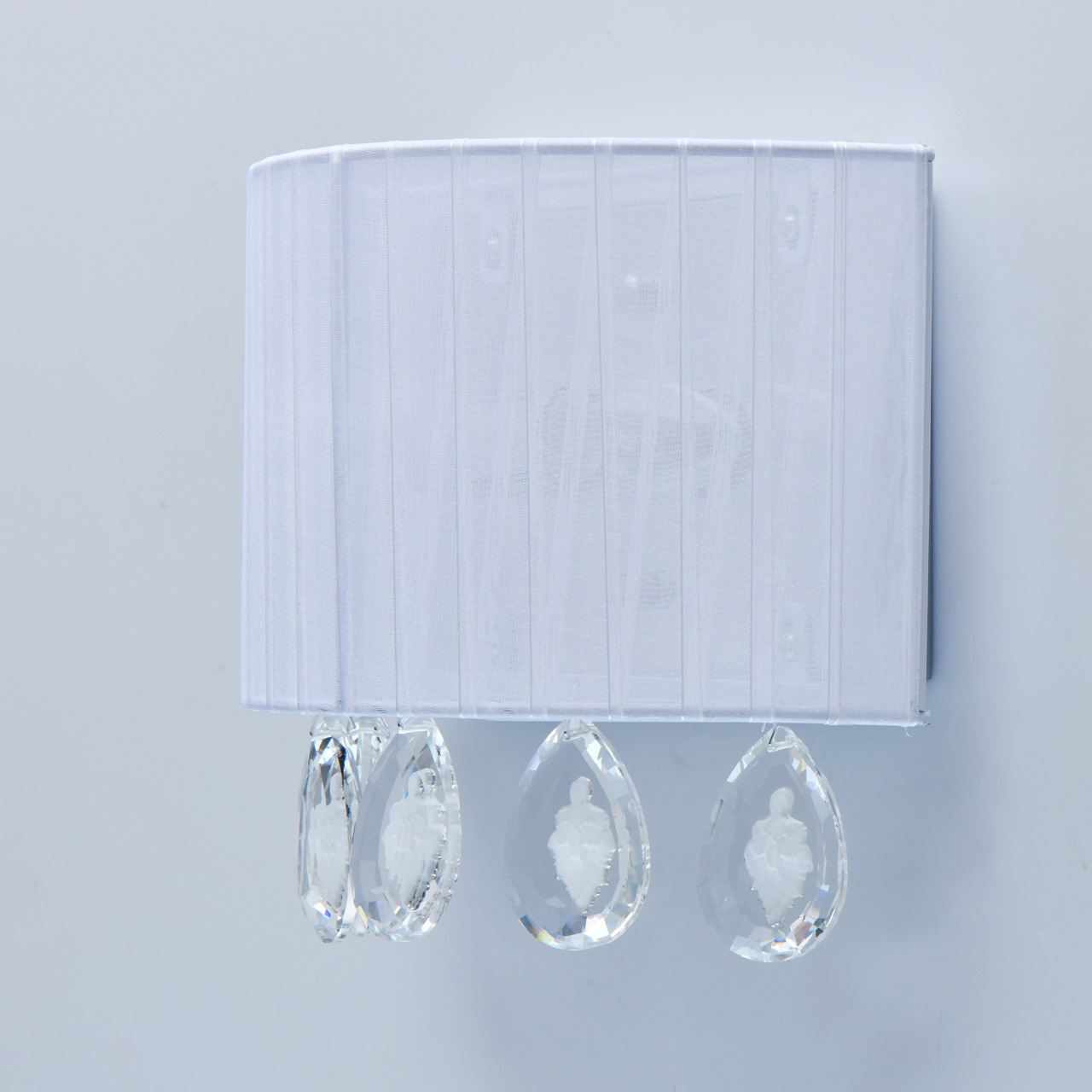 Плафон выполнен из органзы белого цвета. Светильник декорирован прозрачным хрусталем с резной инкрустацией в центре, окрашенной в белый цвет.Тип помещения