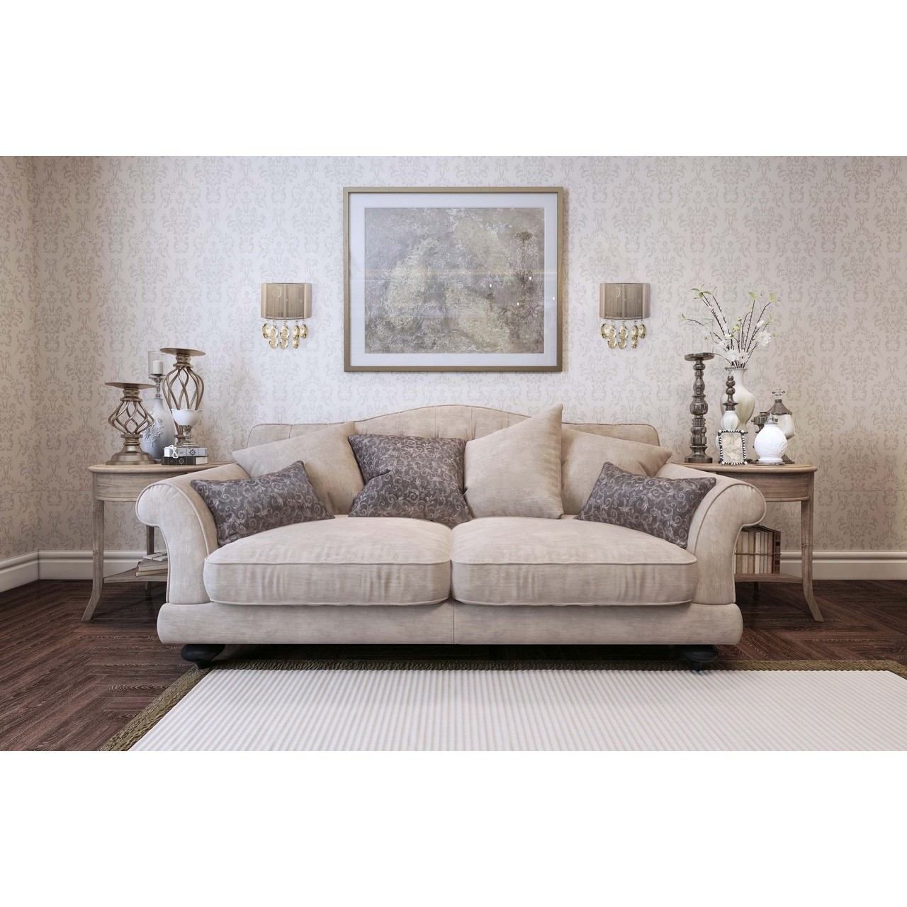 Металлическое основание цвета хрома, абажур, обтянутый тонкими нитями цвета таул, декоративные элементы из хрусталяТехнология производства