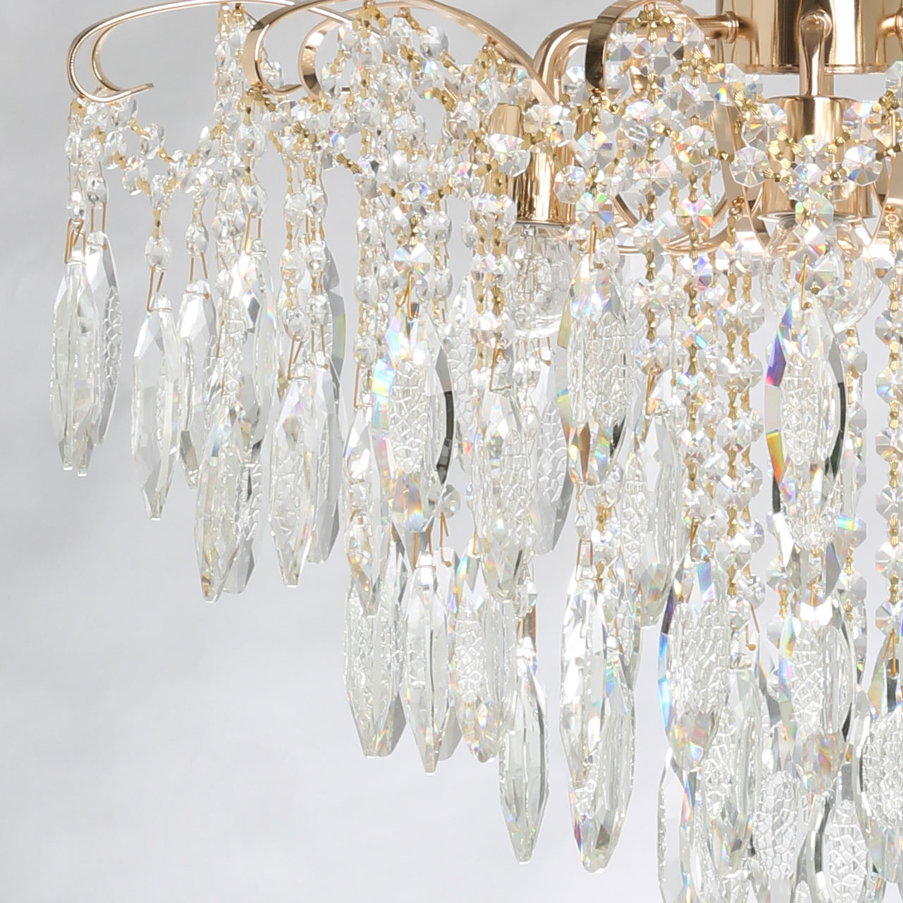 Металлическое основание потолочного светильника выполнено из металл и гальванизировано в золотой цвет. Светильник декорирован подвесками из фактурного прозрачного хрусталя в форме октагон и око.Характеристики
