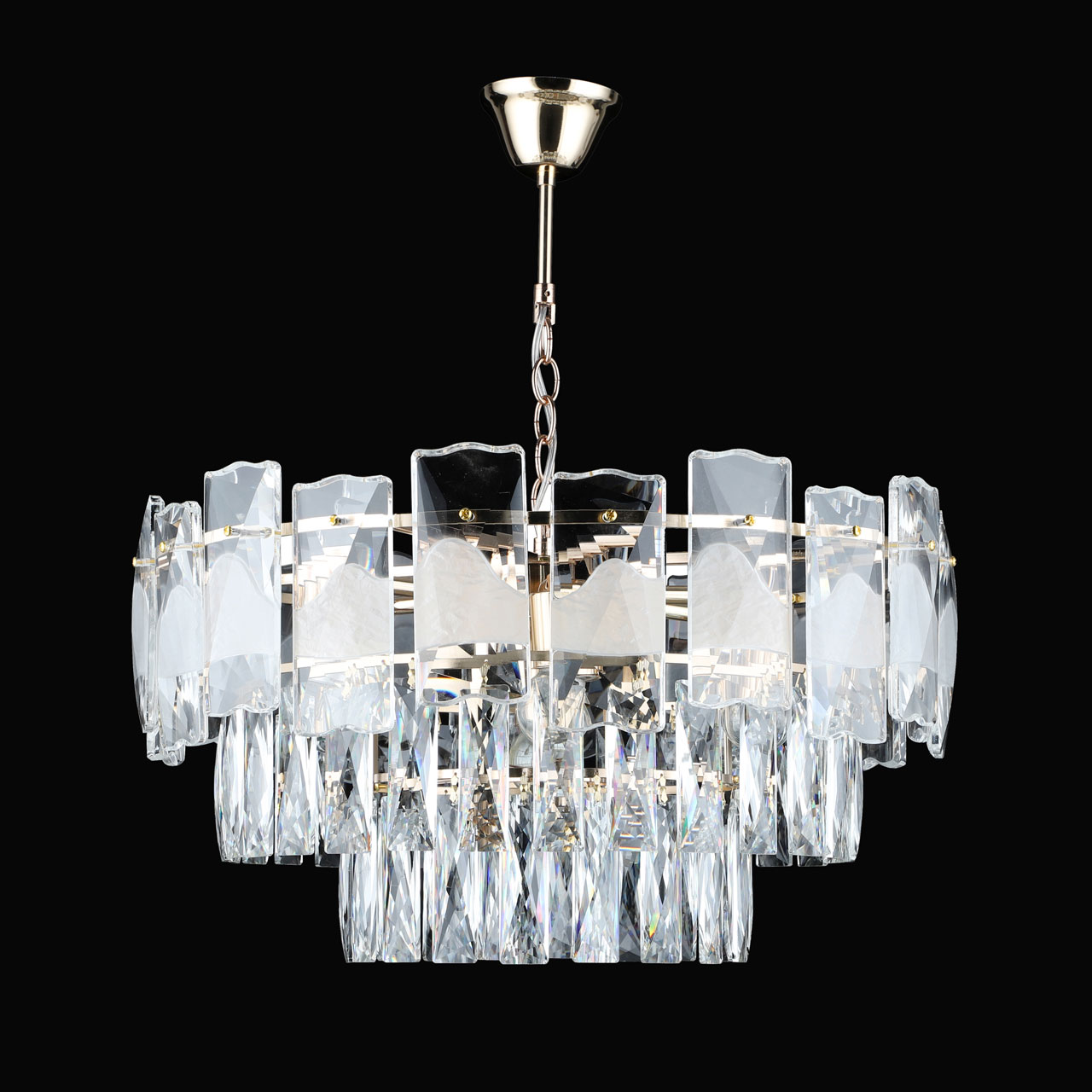 Металлическое основание светильника гальванизировано в цвет золота. Подвесная люстра декорирована прозрачным хрусталем.Характеристики