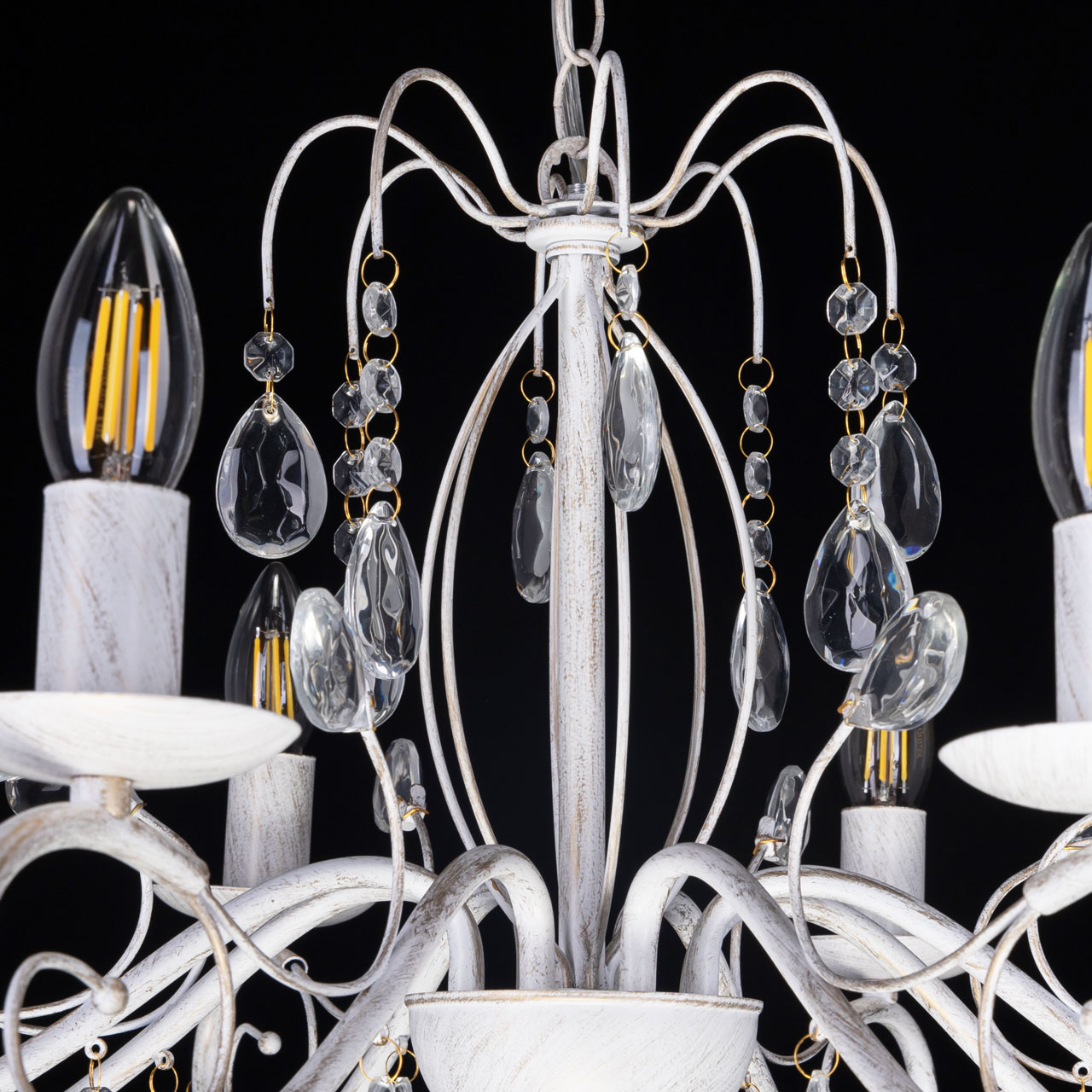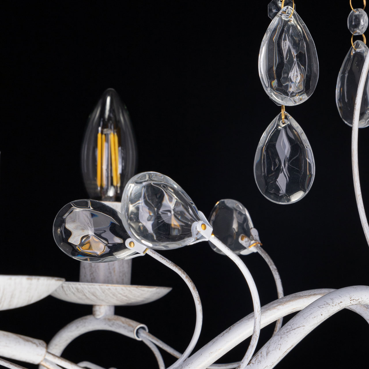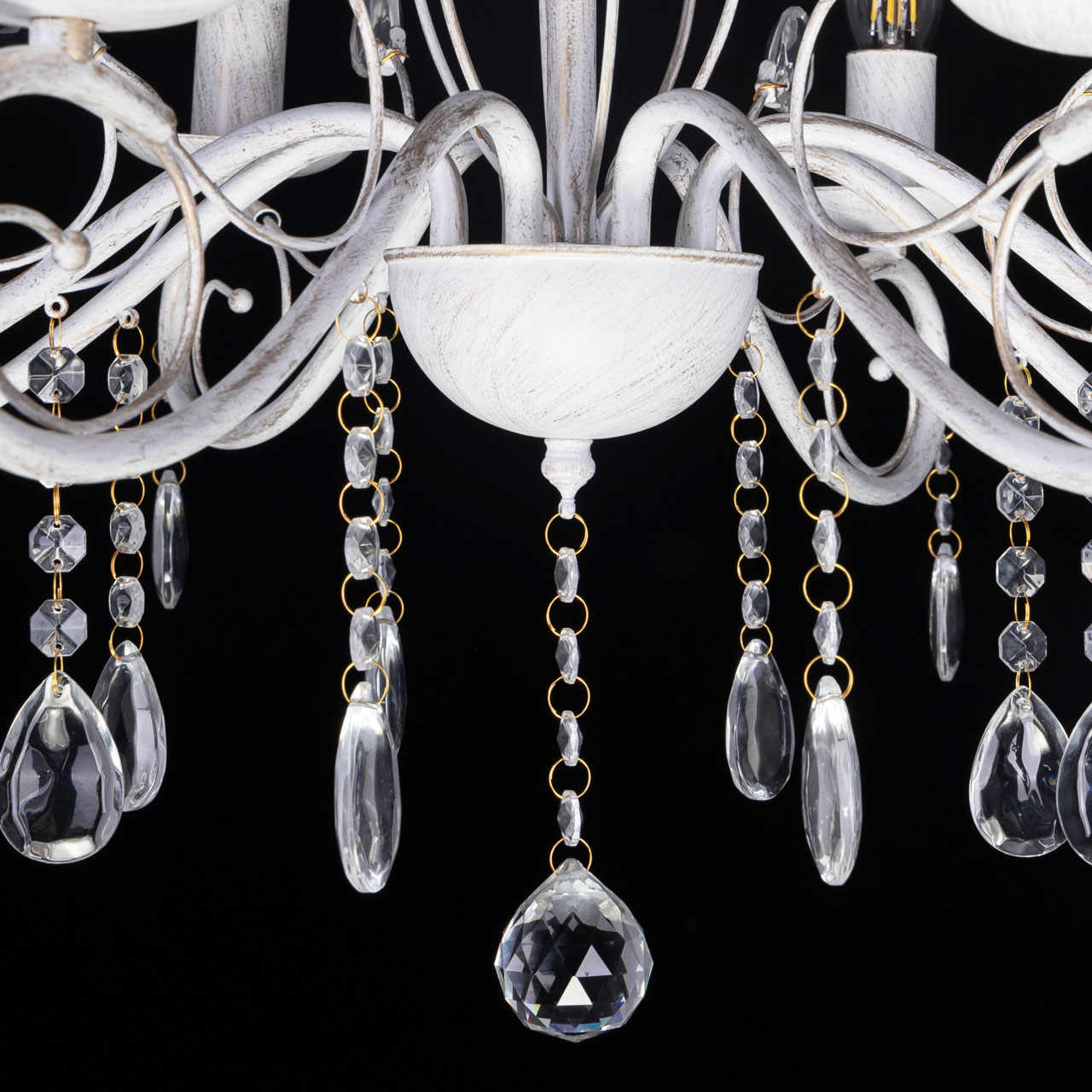 Металлическое основание светильника окрашено в белый цвет и обработано по технологии хай-лайт в золотой цвет. Светильник декорирован стеклянными подвесами миндалевидной формы и хрусталем в форме шара.Характеристики