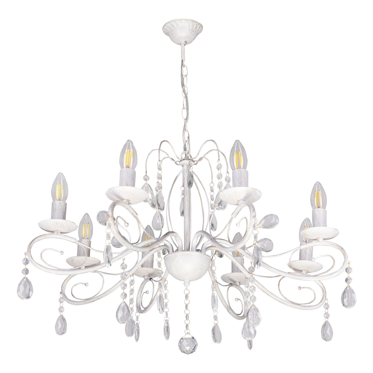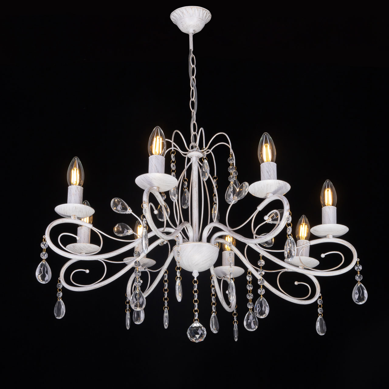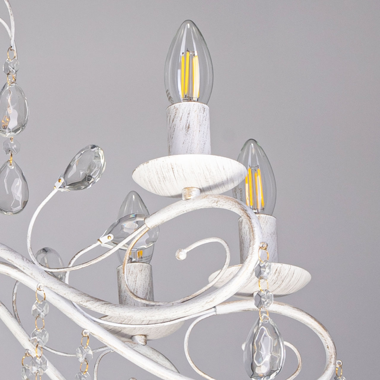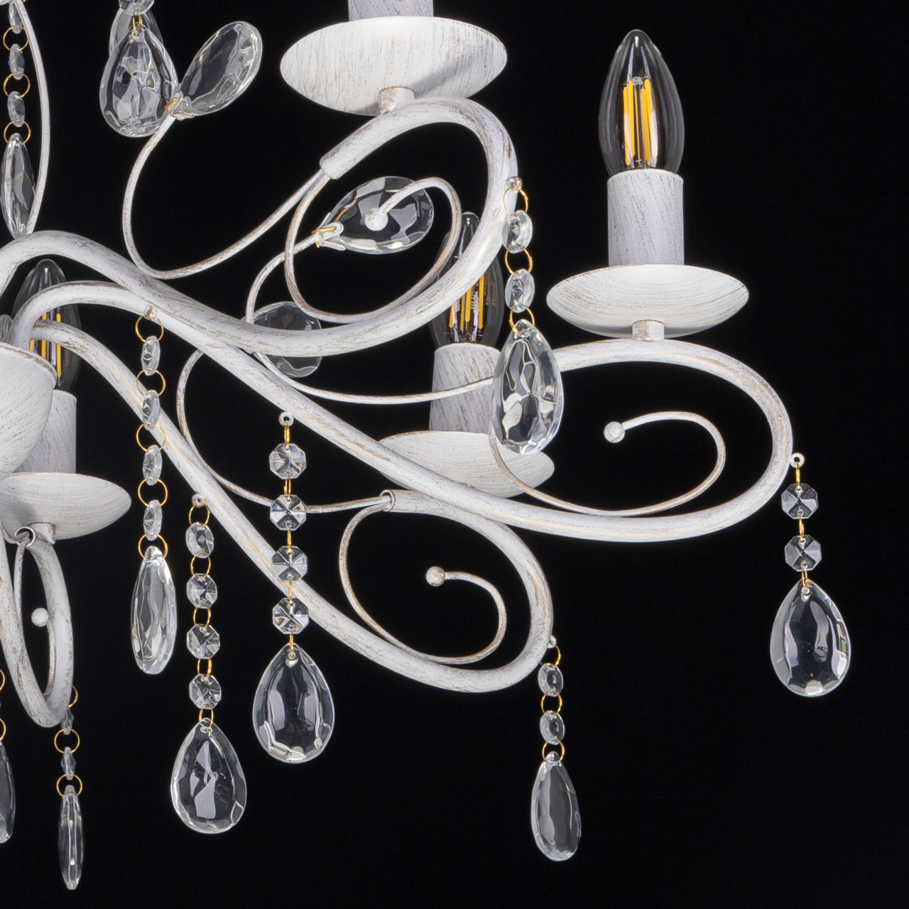 Металлическое основание светильника окрашено в белый цвет и обработано по технологии хай-лайт в золотой цвет. Светильник декорирован стеклянными подвесами миндалевидной формы и хрусталем в форме шара.Характеристики