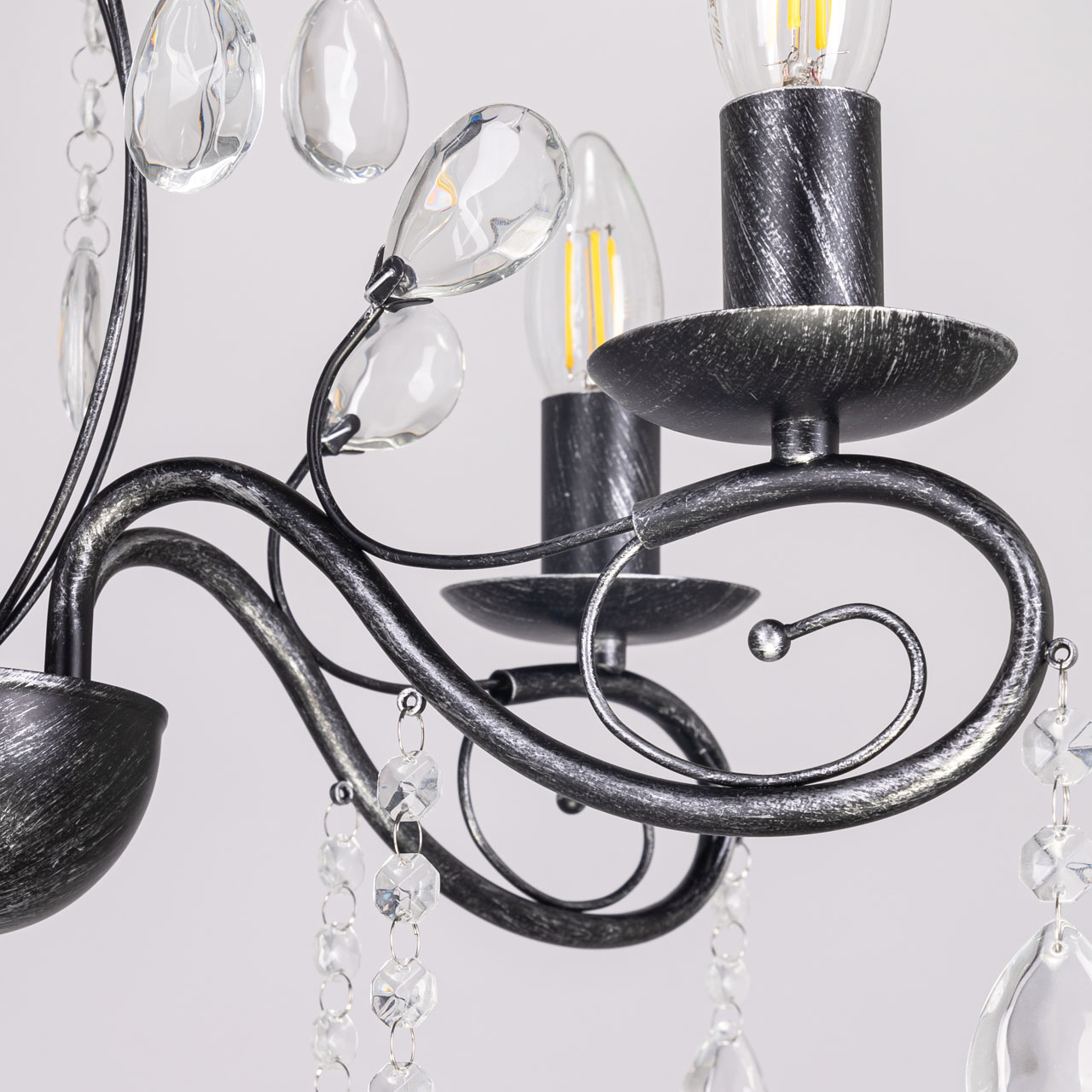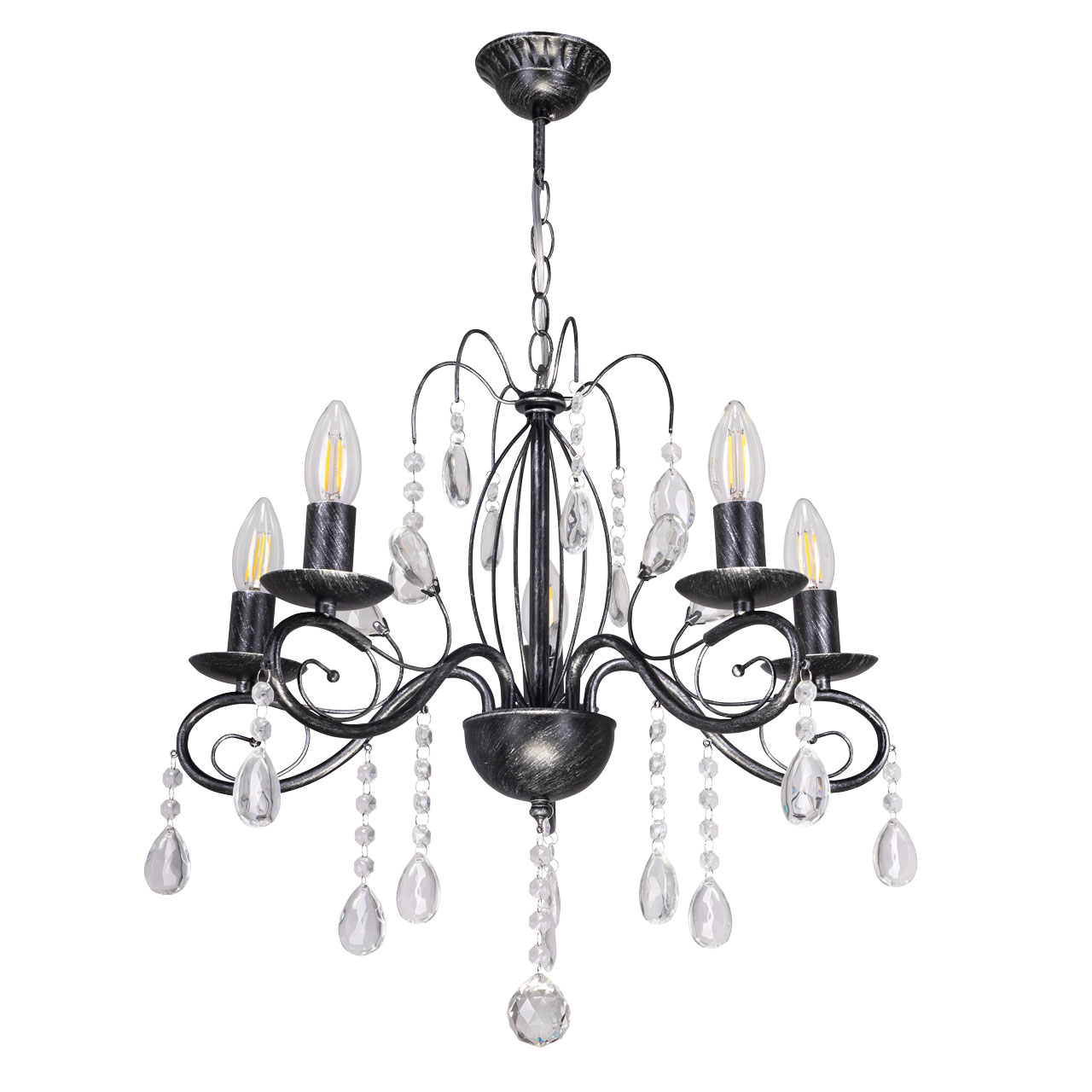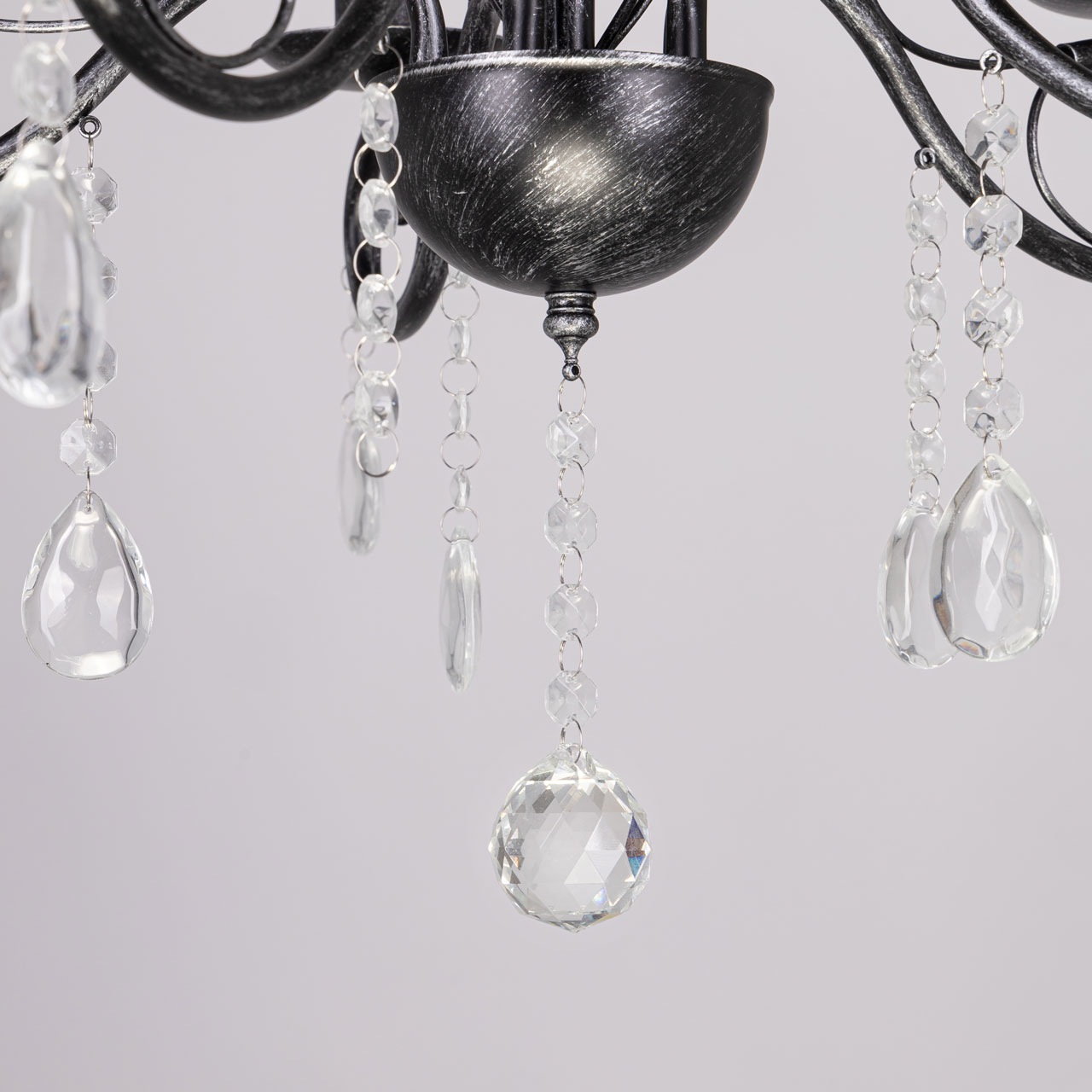Металлическое основание светильника окрашено в черный цвет и обработано по технологии хай-лайт в серебряный цвет. Светильник декорирован стеклянными подвесами миндалевидной формы и хрусталем в форме шара.Характеристики