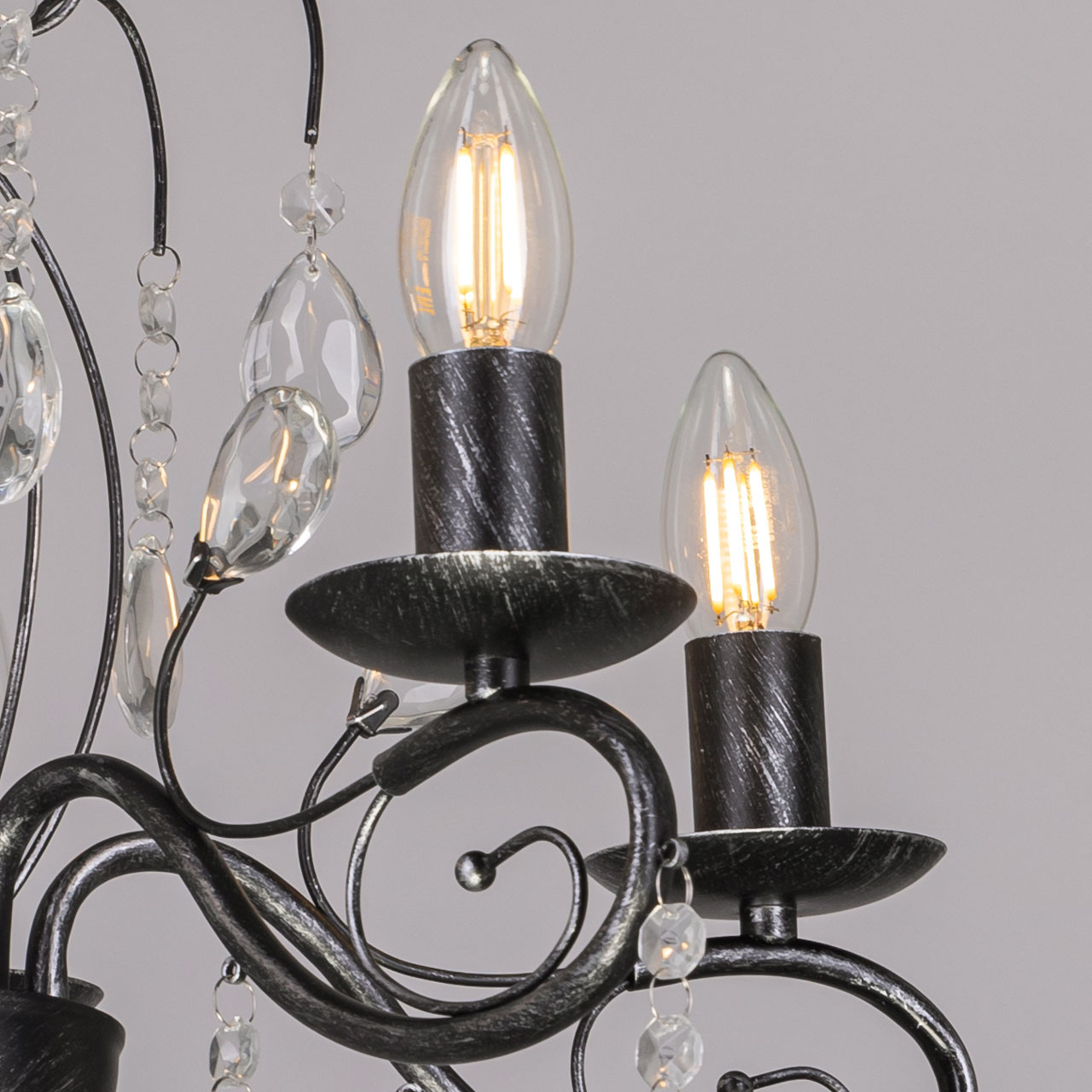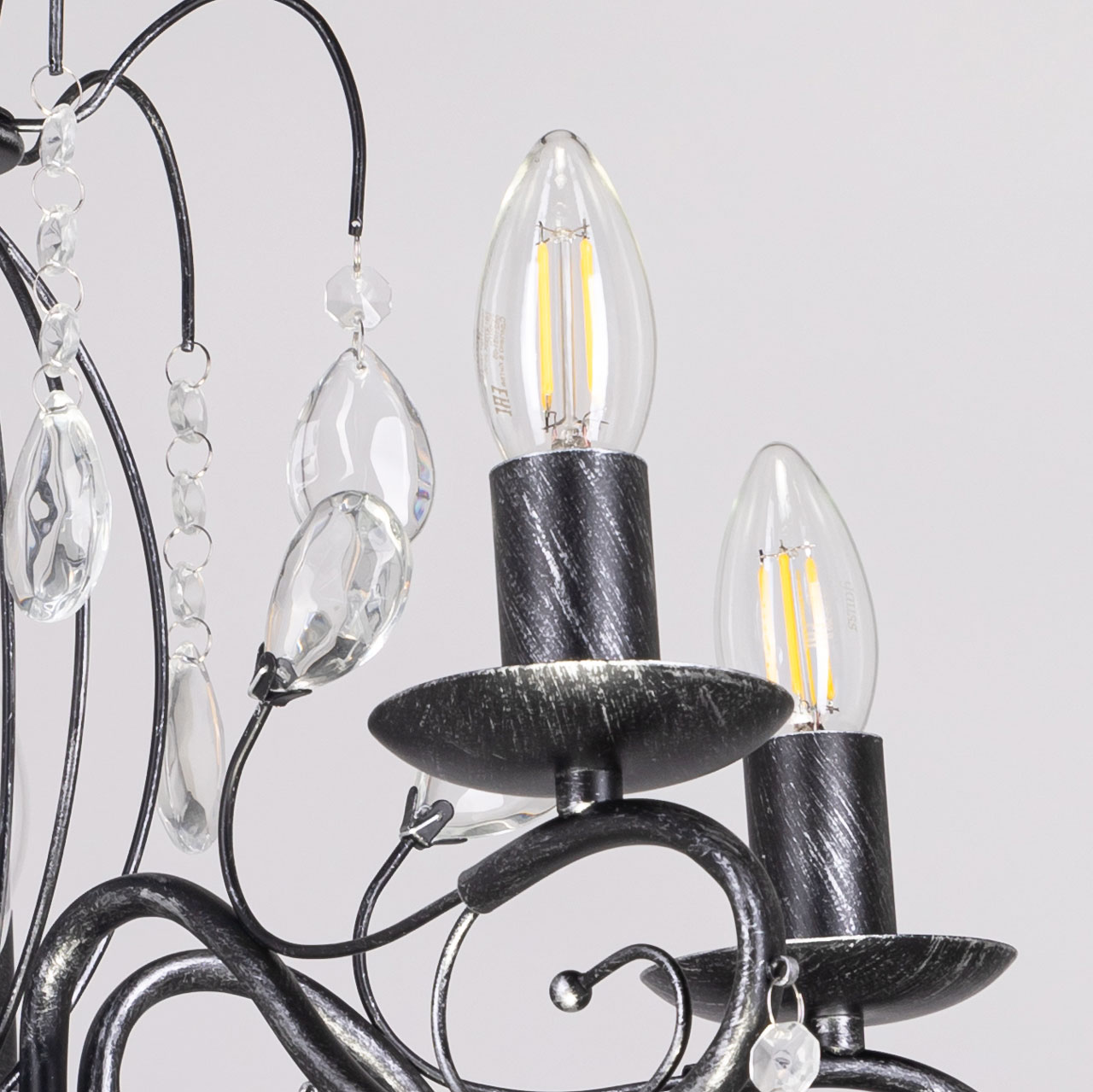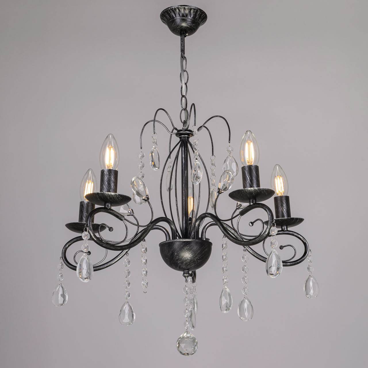 Металлическое основание светильника окрашено в черный цвет и обработано по технологии хай-лайт в серебряный цвет. Светильник декорирован стеклянными подвесами миндалевидной формы и хрусталем в форме шара.Характеристики