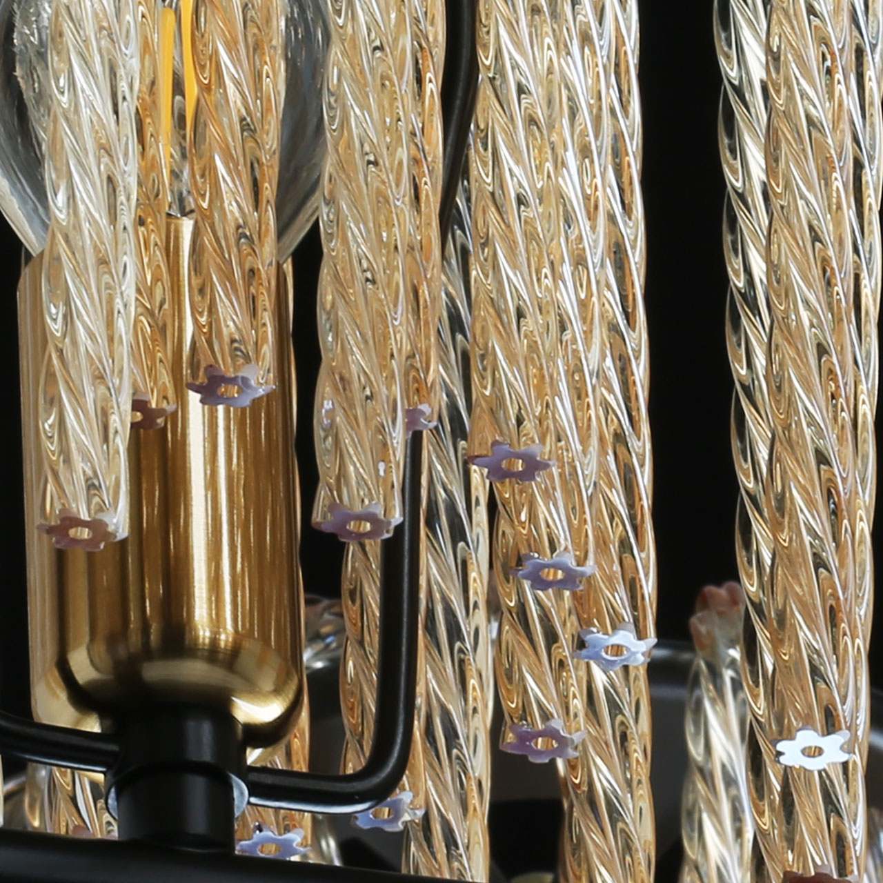 Трендовое сочетание черного цвета основания и цвета бронзы. Эффектный декор из стекла придает потолочной люстре воздушности. Стекло декора цвета топаз создает красивую игру света. Заменяемые источники света удобны в эксплуатации.Технология производства