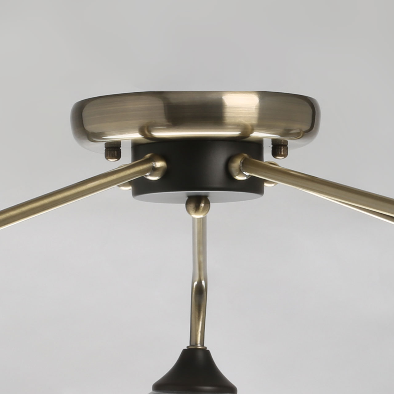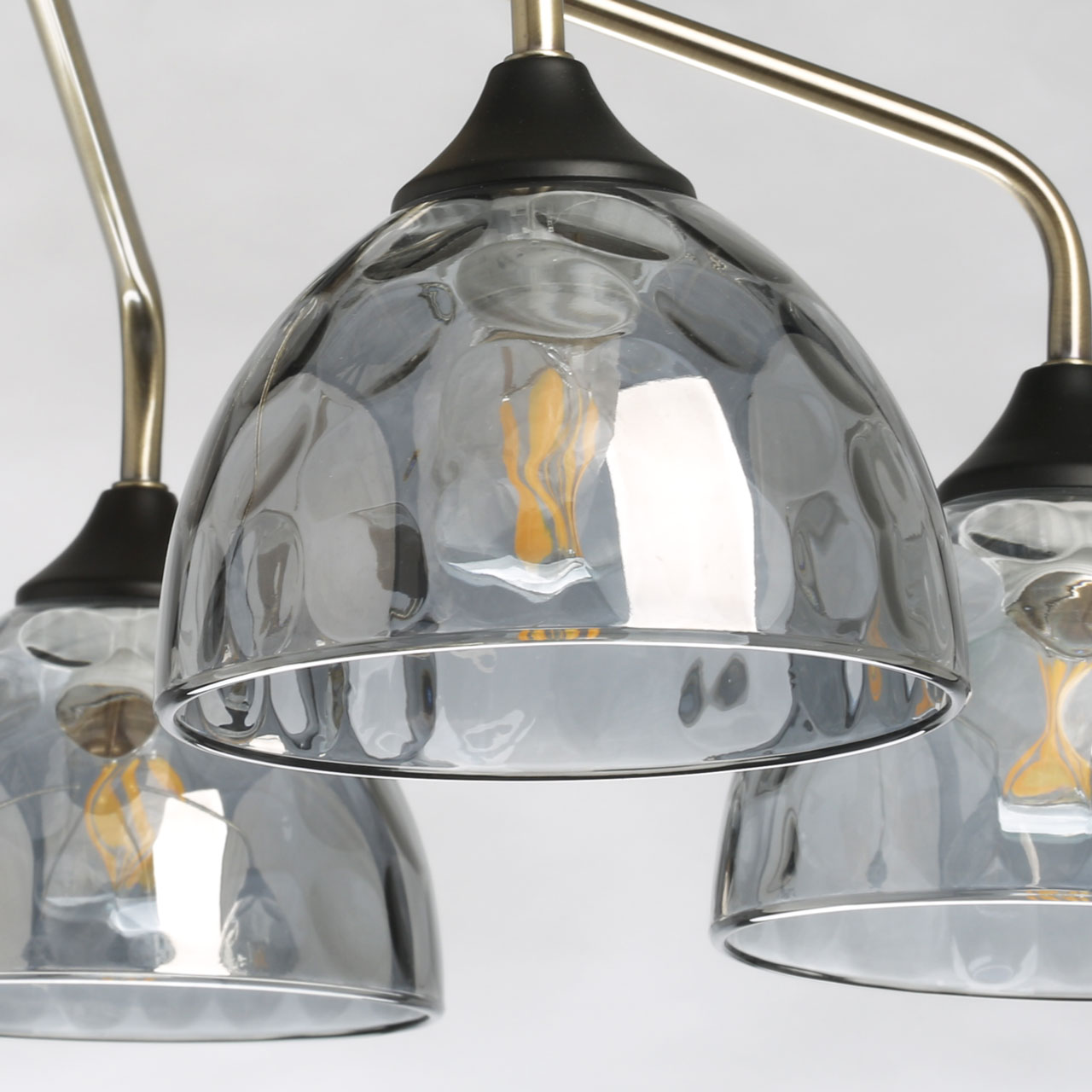Металлическое основание потолочного светильника гальванизировано в цвет античной бронзы. Отдельные элементы окрашены в черный цвет. Светильник декорирован выдувными в форму стеклянными плафонами, гальванизированными в дымчатый цвет.Характеристики