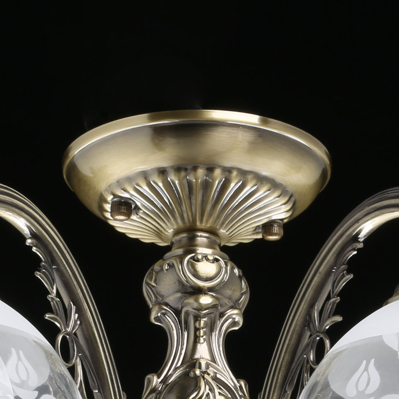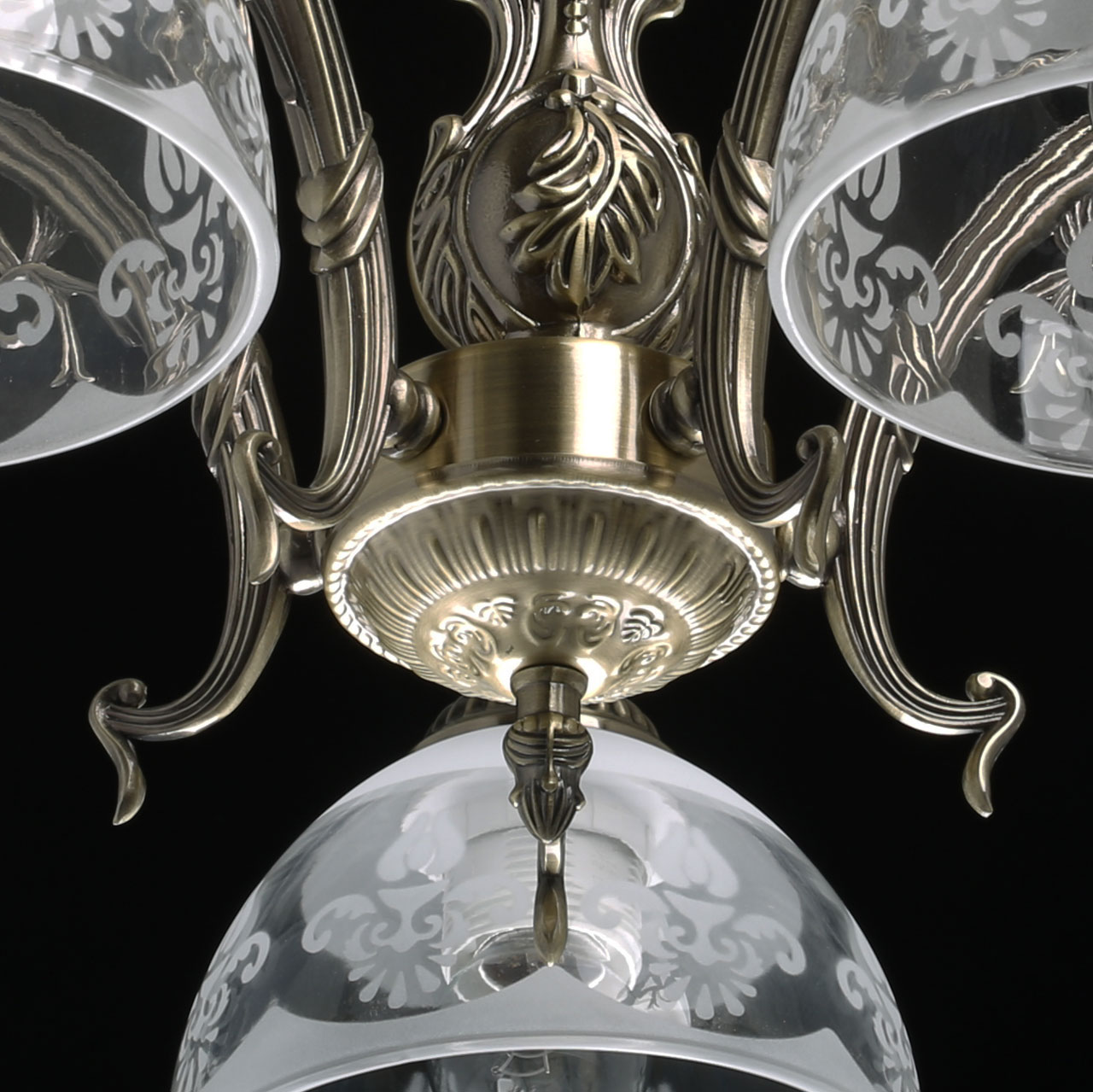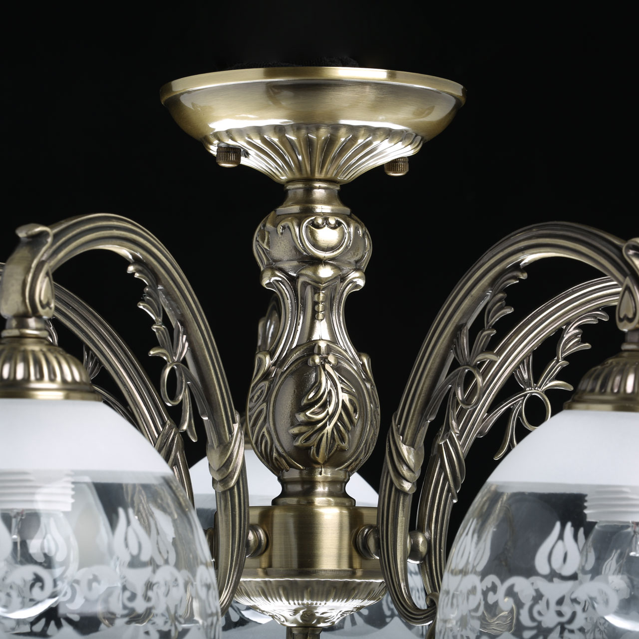 Актуальный цвет античной бронзы. Классический дизайн в дворцовом стиле. Стеклянные плафоны вниз с растительным орнаментом в тренде Компактные размеры высоты светильника подойдут для стандартных потолков. Заменяемые источники света удобны в эксплуатации.Технология производства