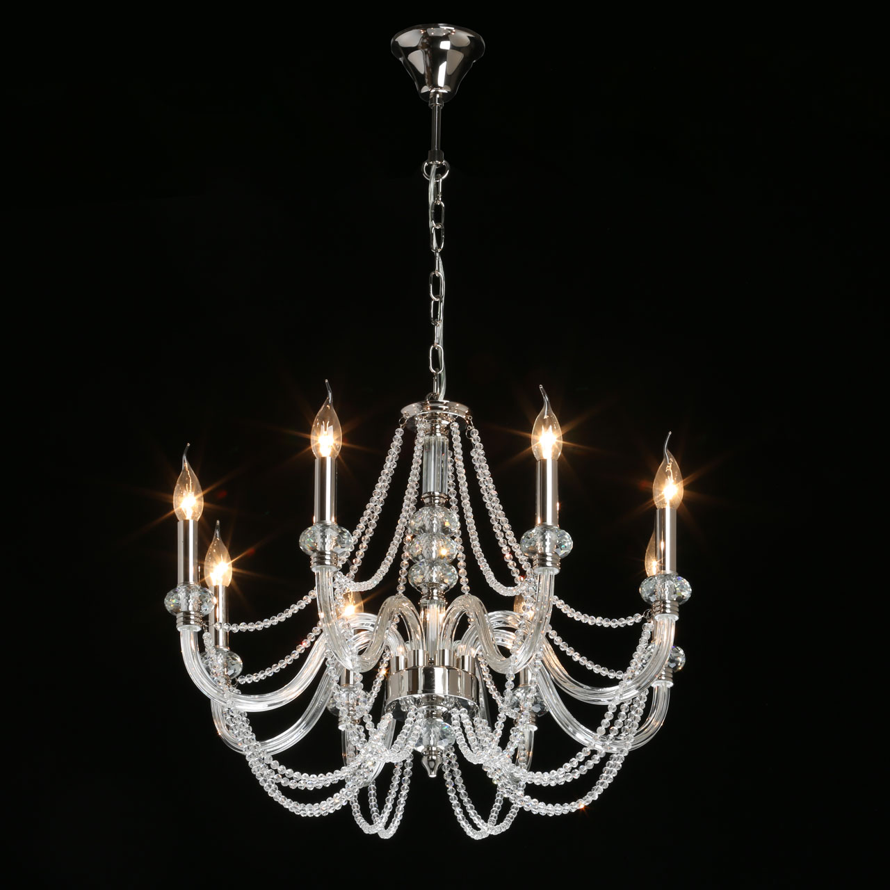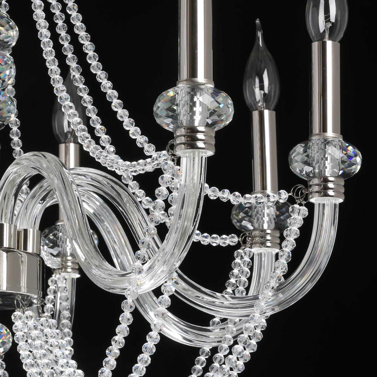 Сочетание классических форм и современного цвета хрома выделяет люстру. Выдувное стекло ручной работы придает подвесной люстре легкости. Декор из массива хрусталя и хрустальных бус создает красивый свет. Заменяемые источники света удобны в эксплуатации.Технология производства