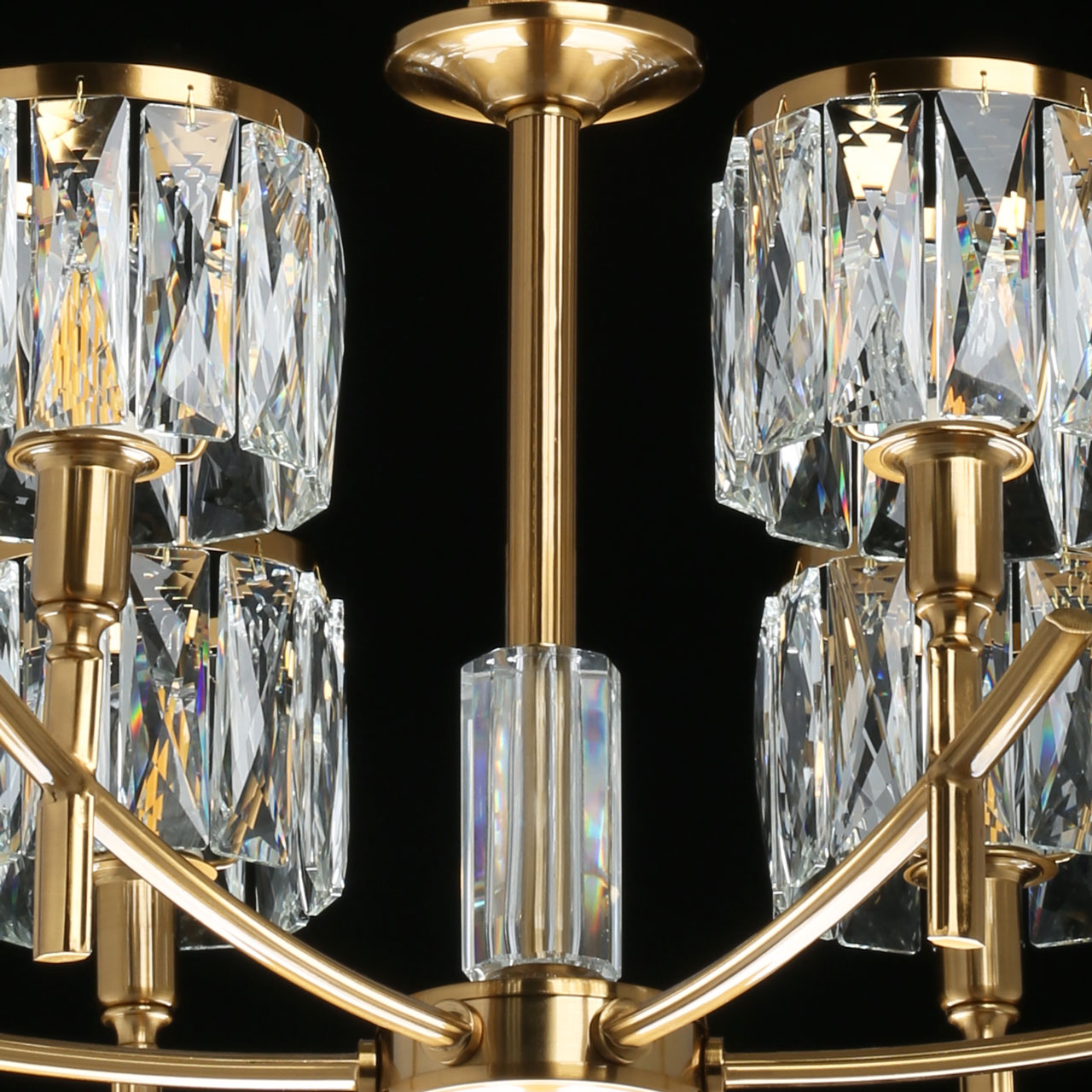 Металлическое основание светильника гальванизировано в цвет бронзы. Плафоны люстры декорированы прозрачным хрусталем прямоугольной формы со сложной огранкой.Характеристики