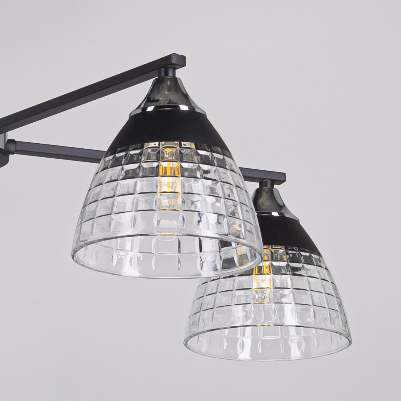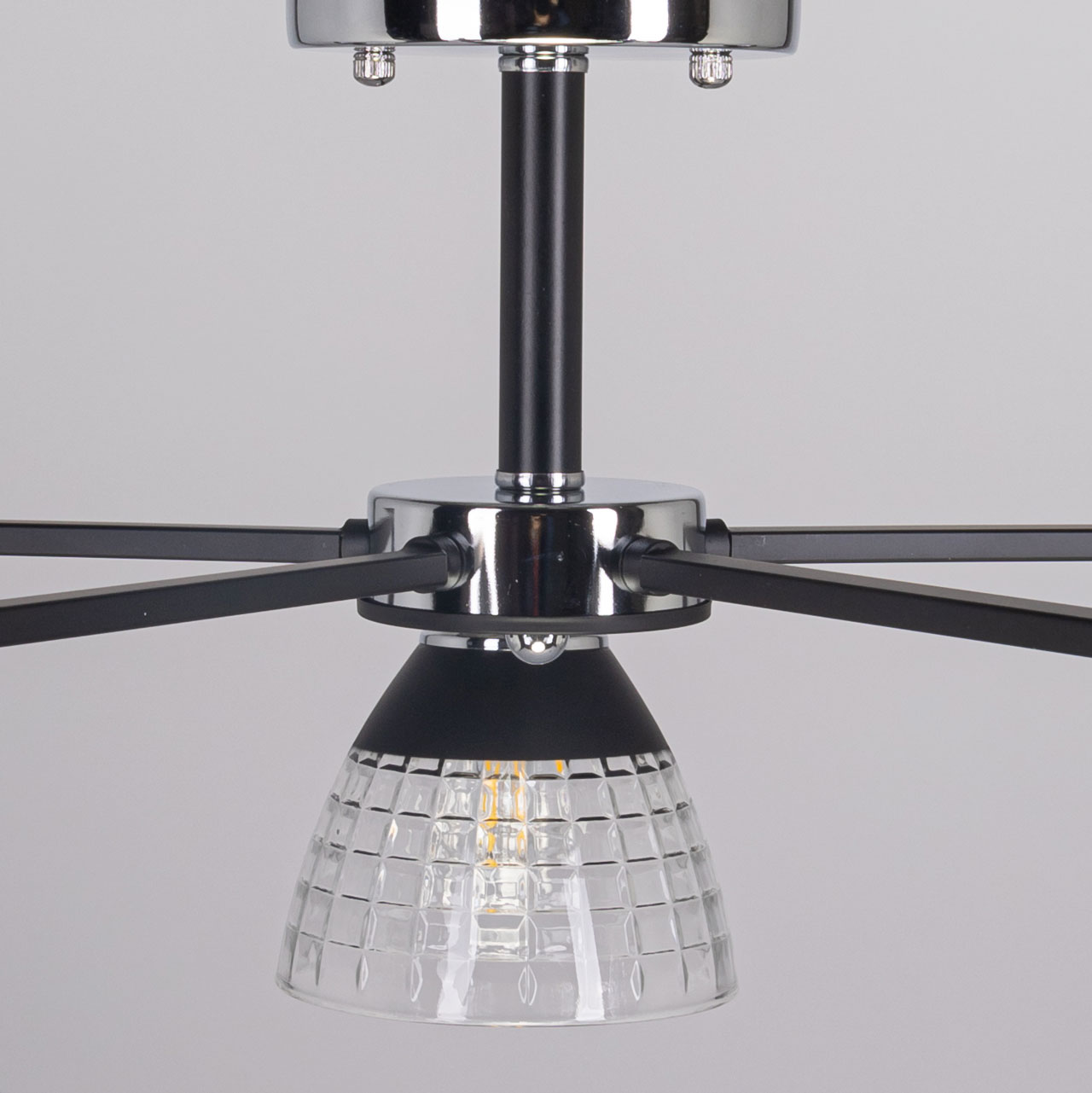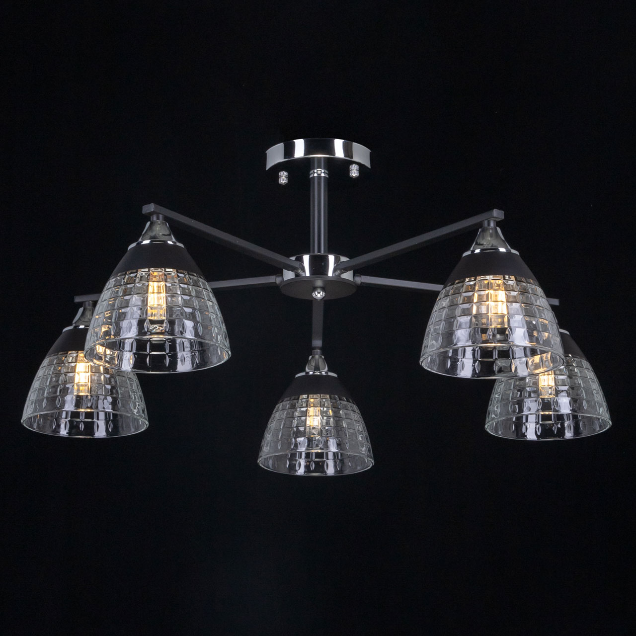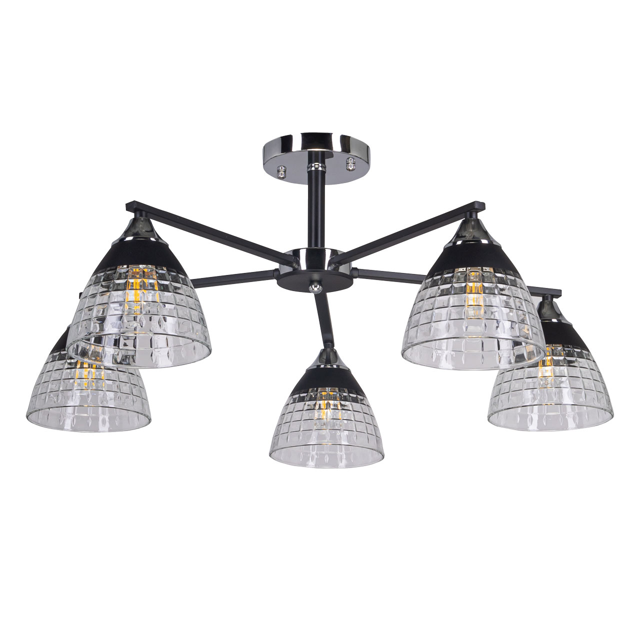 Металлическое основание потолочной люстры гальванизировано в цвет хрома. Отдельные элементы основания окрашены в черный цвет. Потолочная люстра декорирована плафонами из фактурного стекла. У основания стеклянные плафоны окрашены в черный цвет.Характеристики