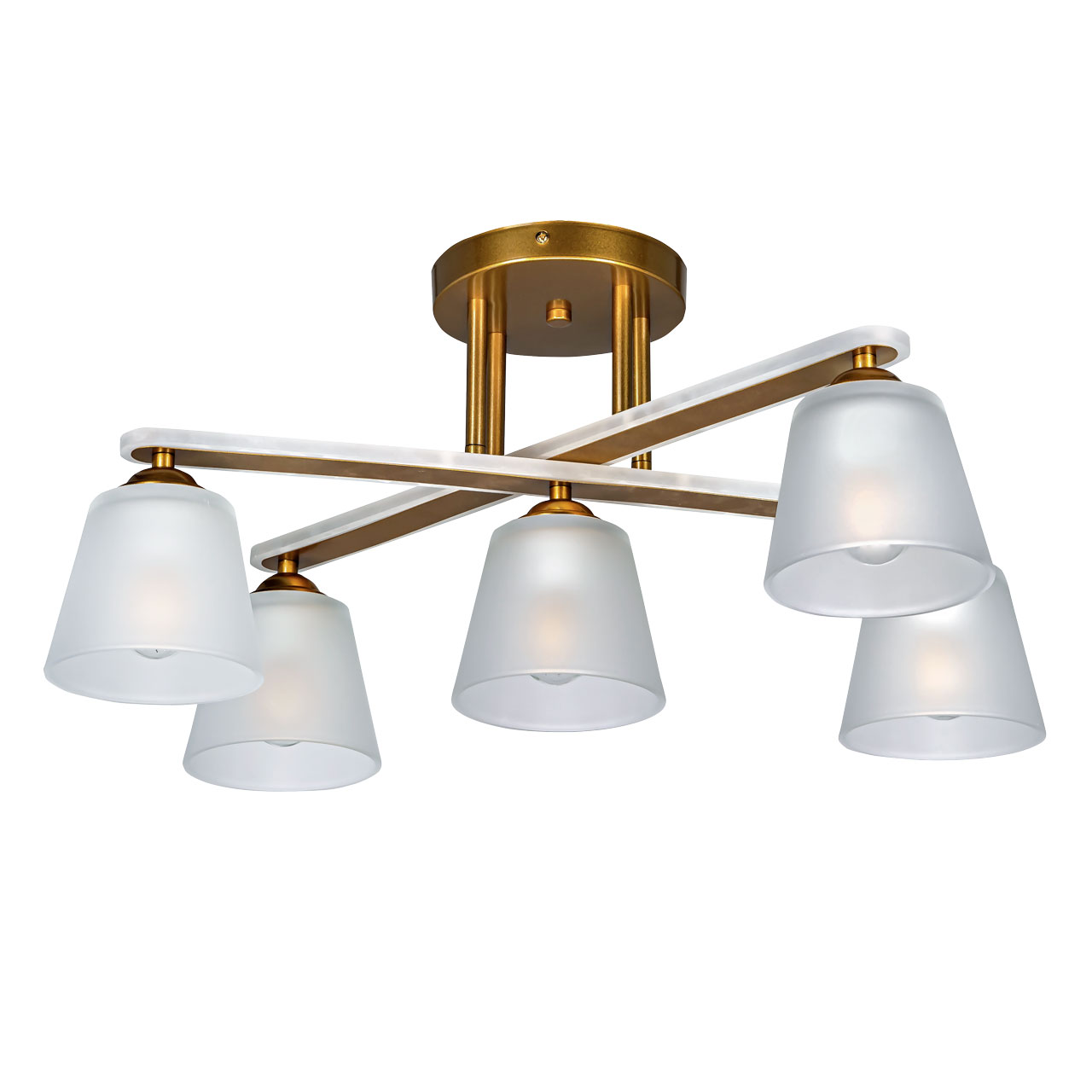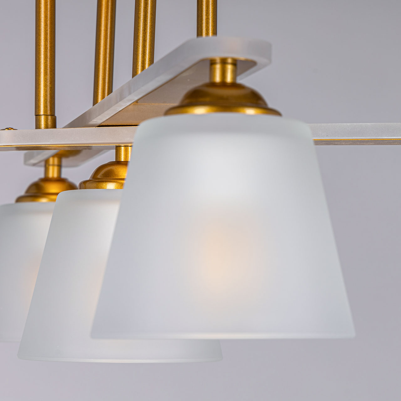 Металлическое основание светильника окрашено в цвет перламутрового золота. Светильник декорирован стеклянными матированными плафонами и матовым акрилом на рожках.Характеристики