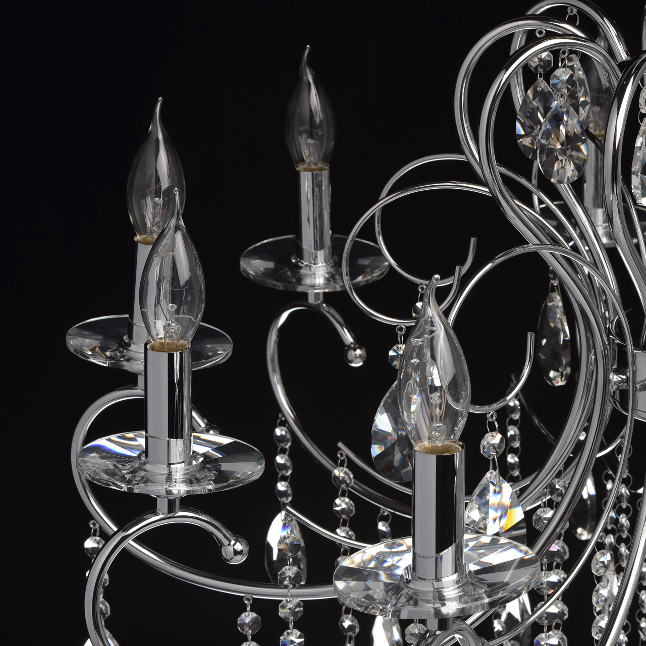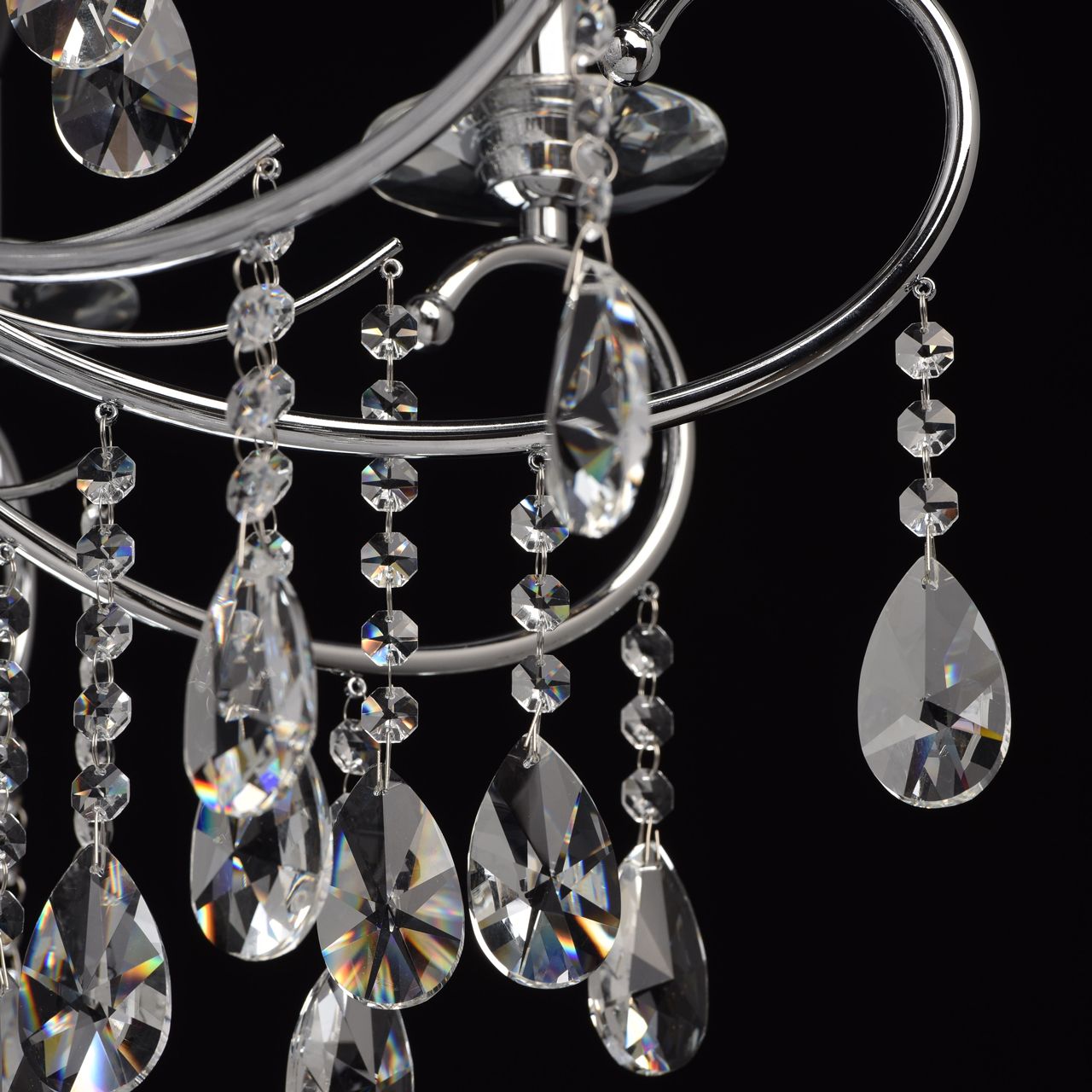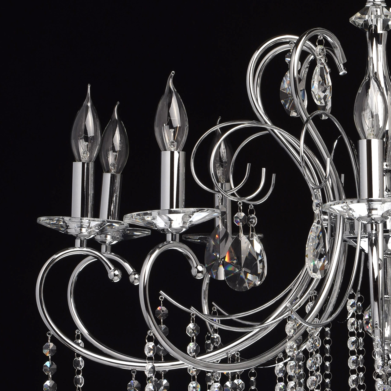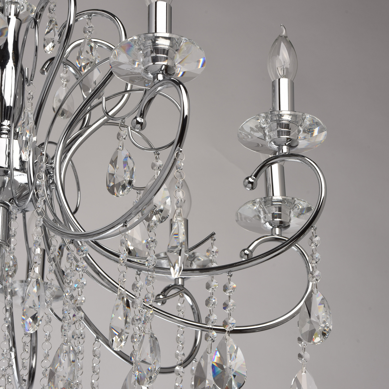 Основание: металл, гальванизировано в цвет хрома. Рожки и декоративные элементы выполнены по технологии проката на роликовом станке. Центральная ось декорирована массивами хрусталя со сложной огранкой. Декоративные розетки выполнены из массива хрусталя. Светильник декорирован подвесками из хрусталя высокого качества формы октагон и миндаль.Тип помещения